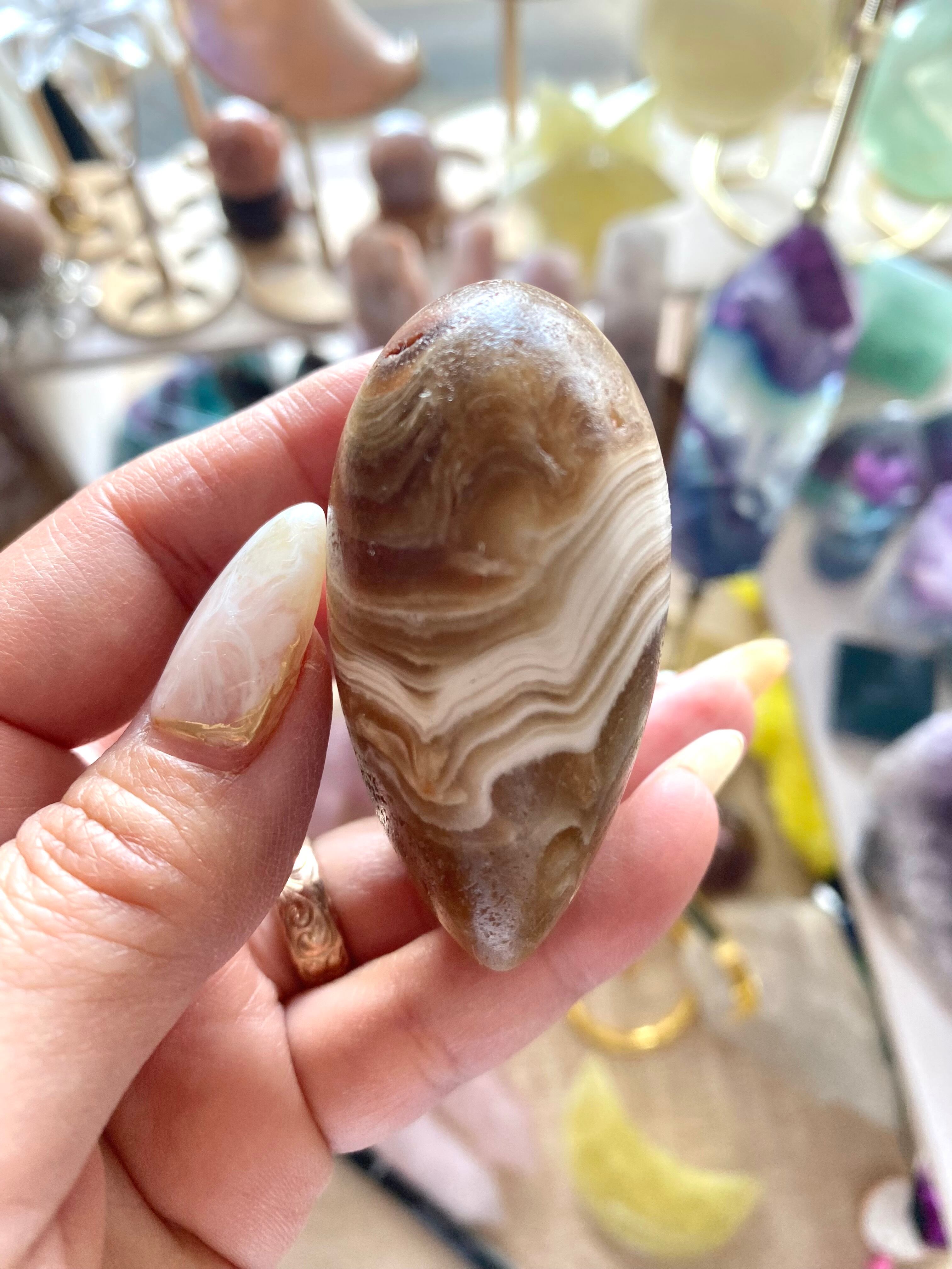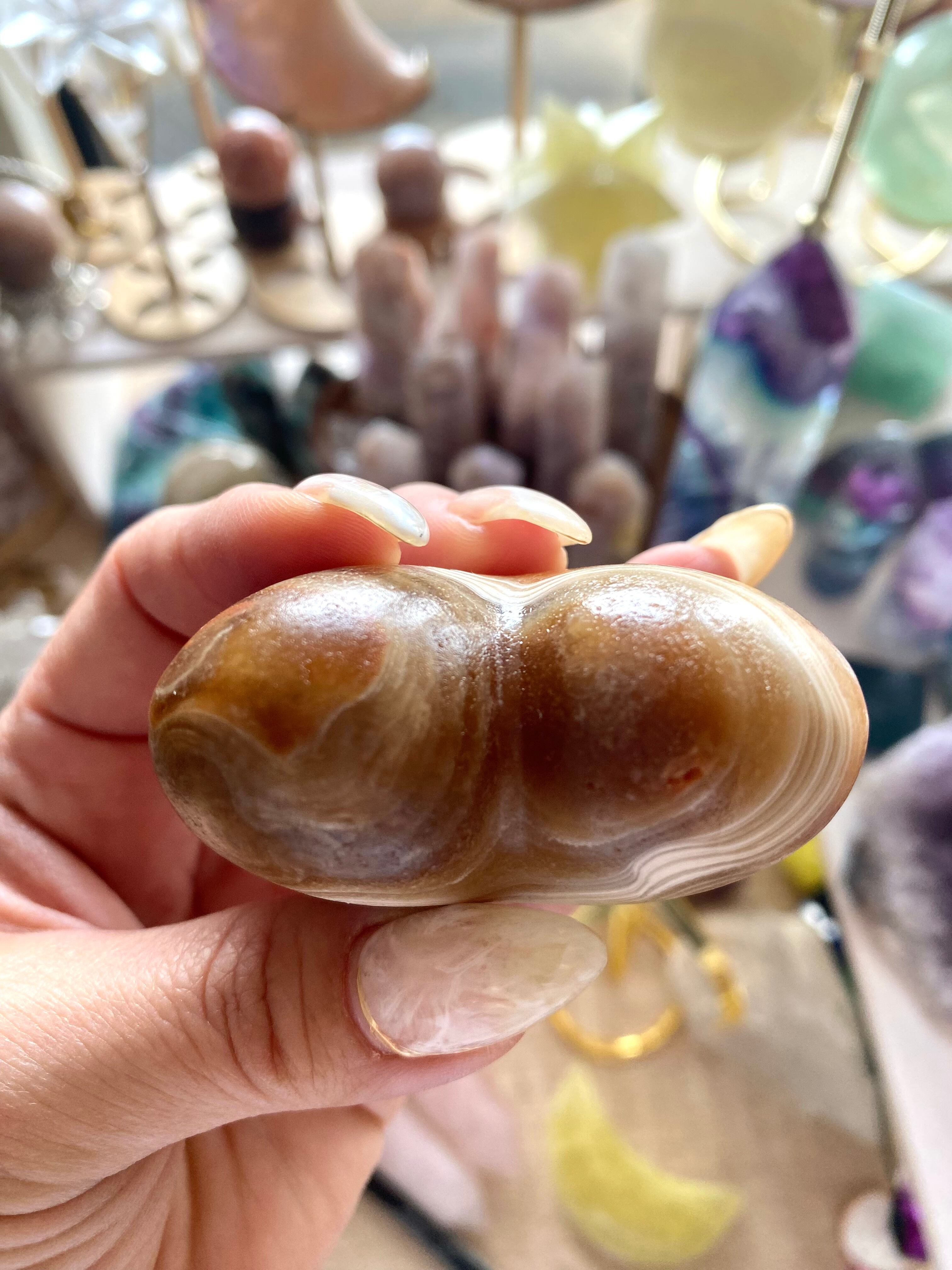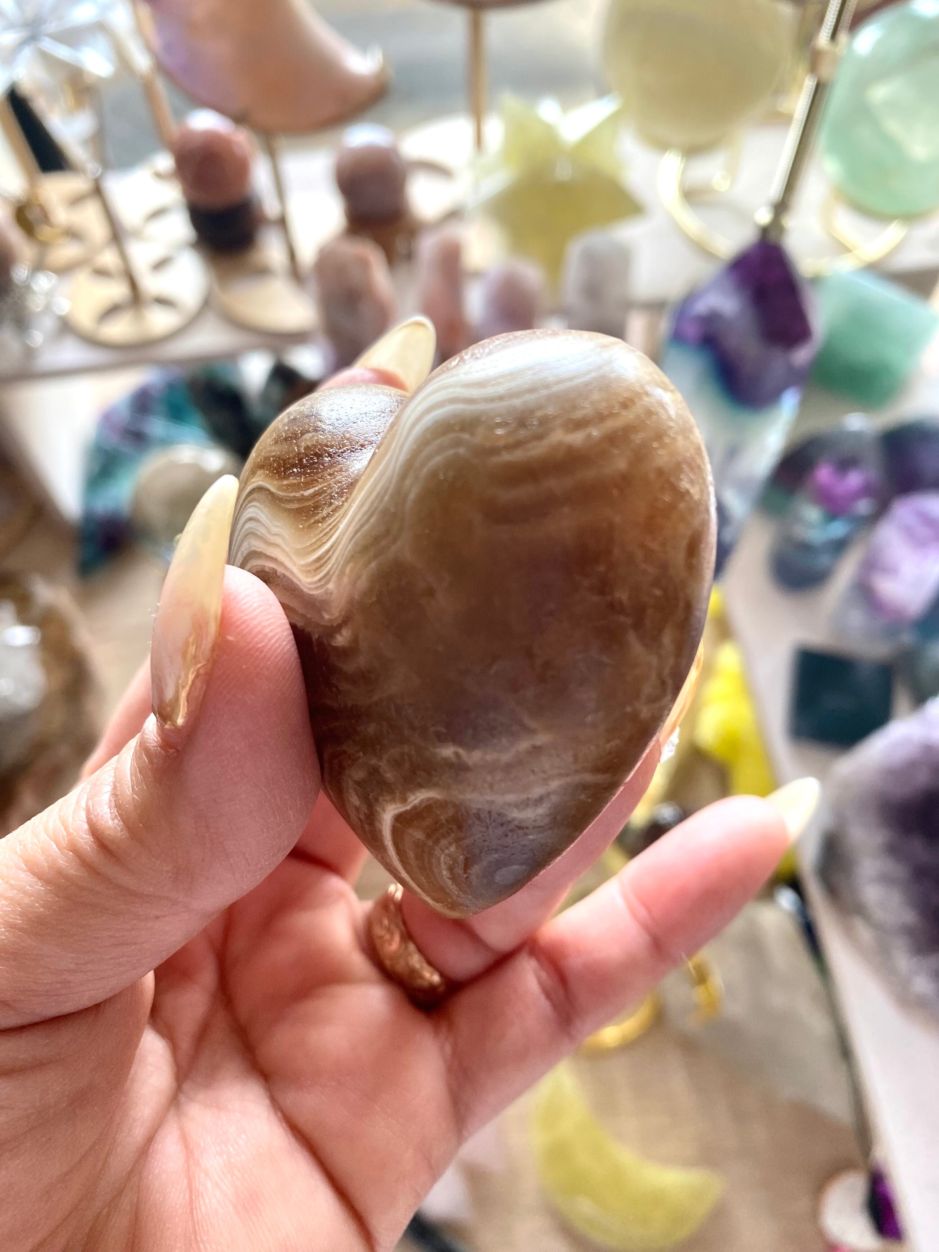 チョコレートカルサイトは、持つ人の小さな幸せをサポートします。 喜びのための石です。 チョコレートを楽しみに食べるような、目の前のコーヒーを楽しむような、至福の瞬間をもたらしてくれます。 繁栄と成長の石でもあり、自分の願いに気づき、人生のハッピーに気づく心を養わせてくれます。