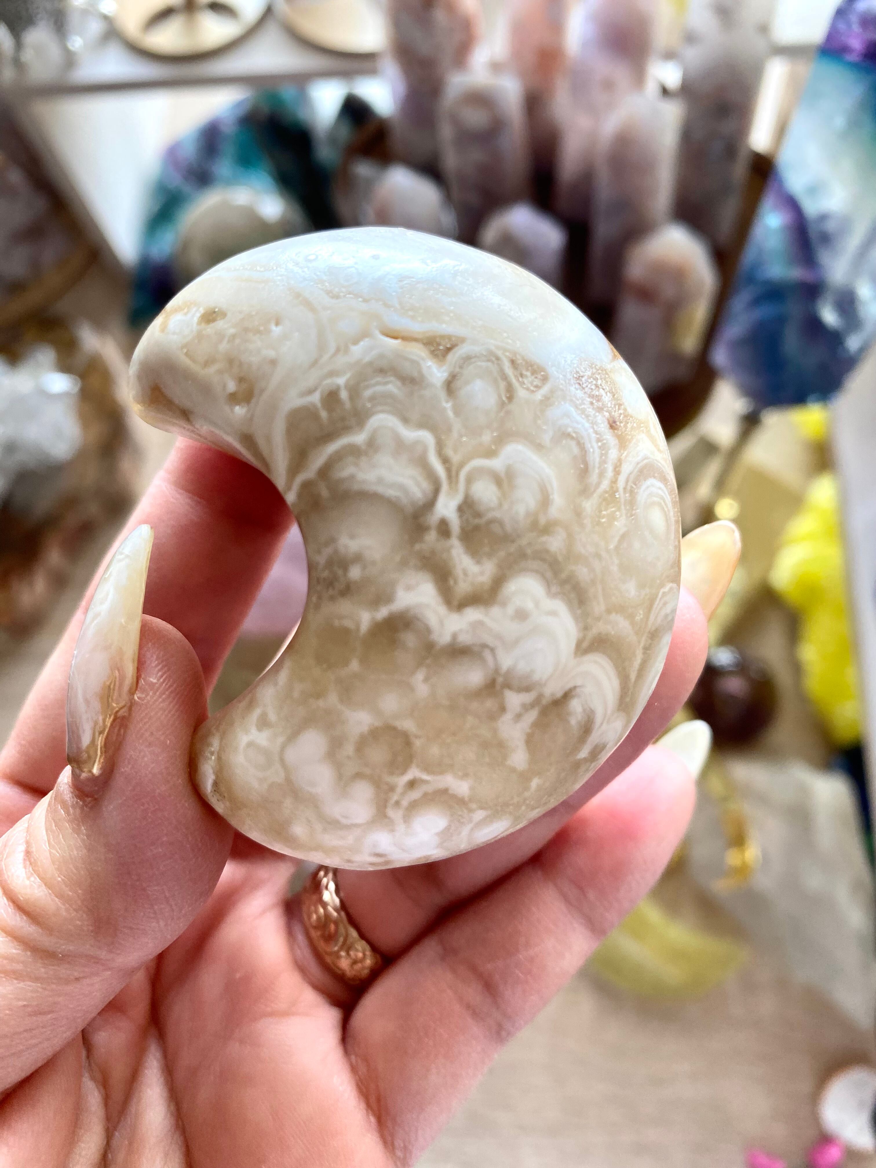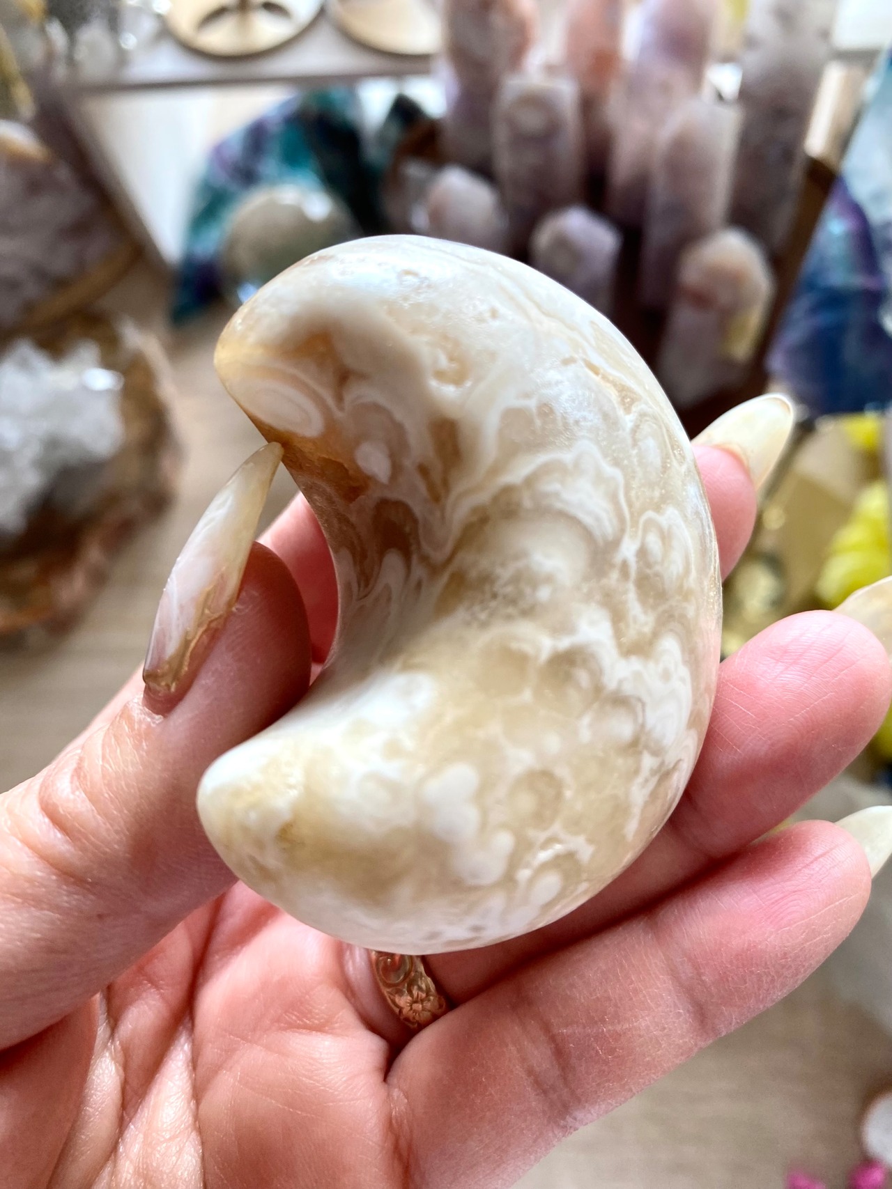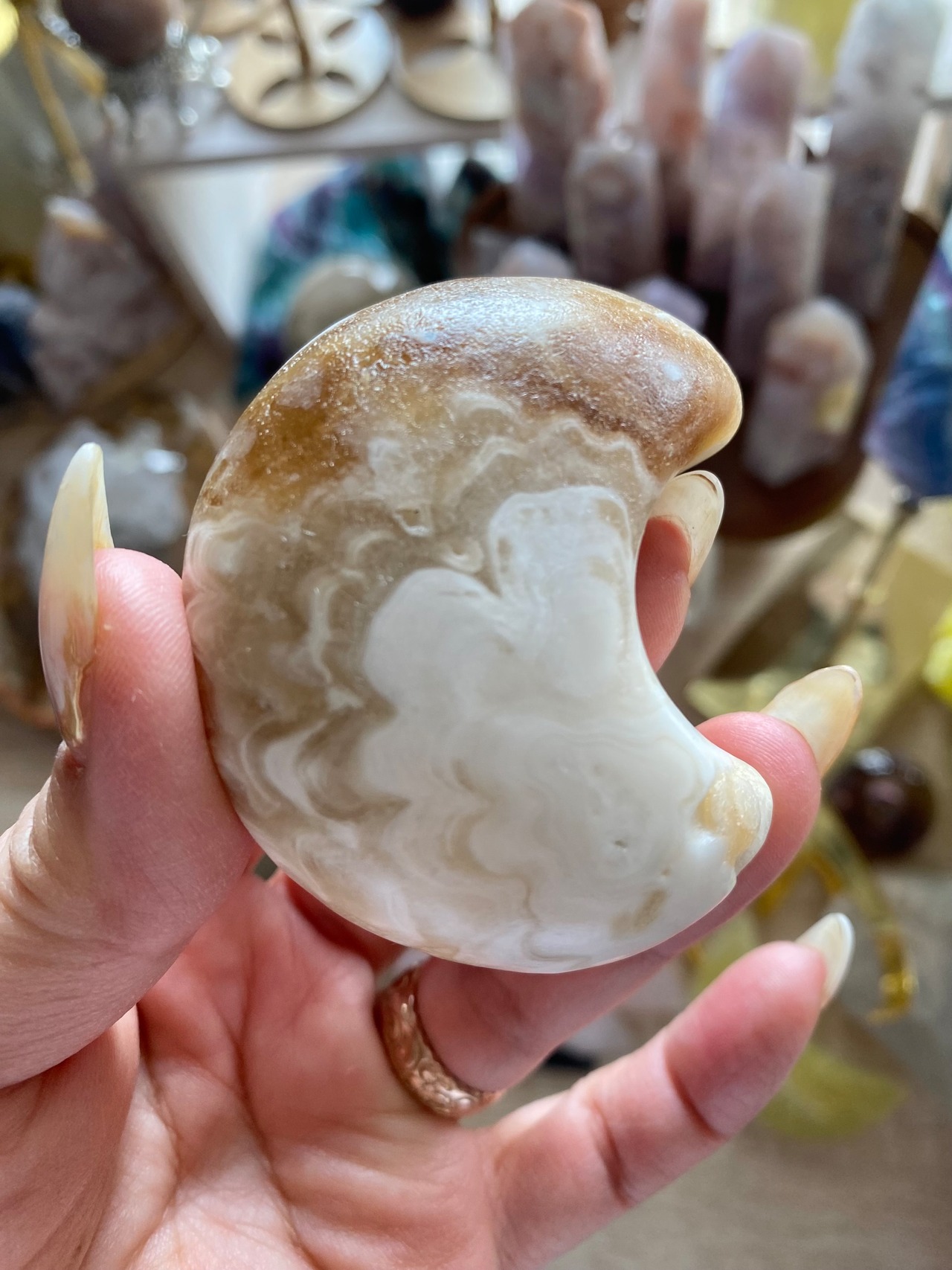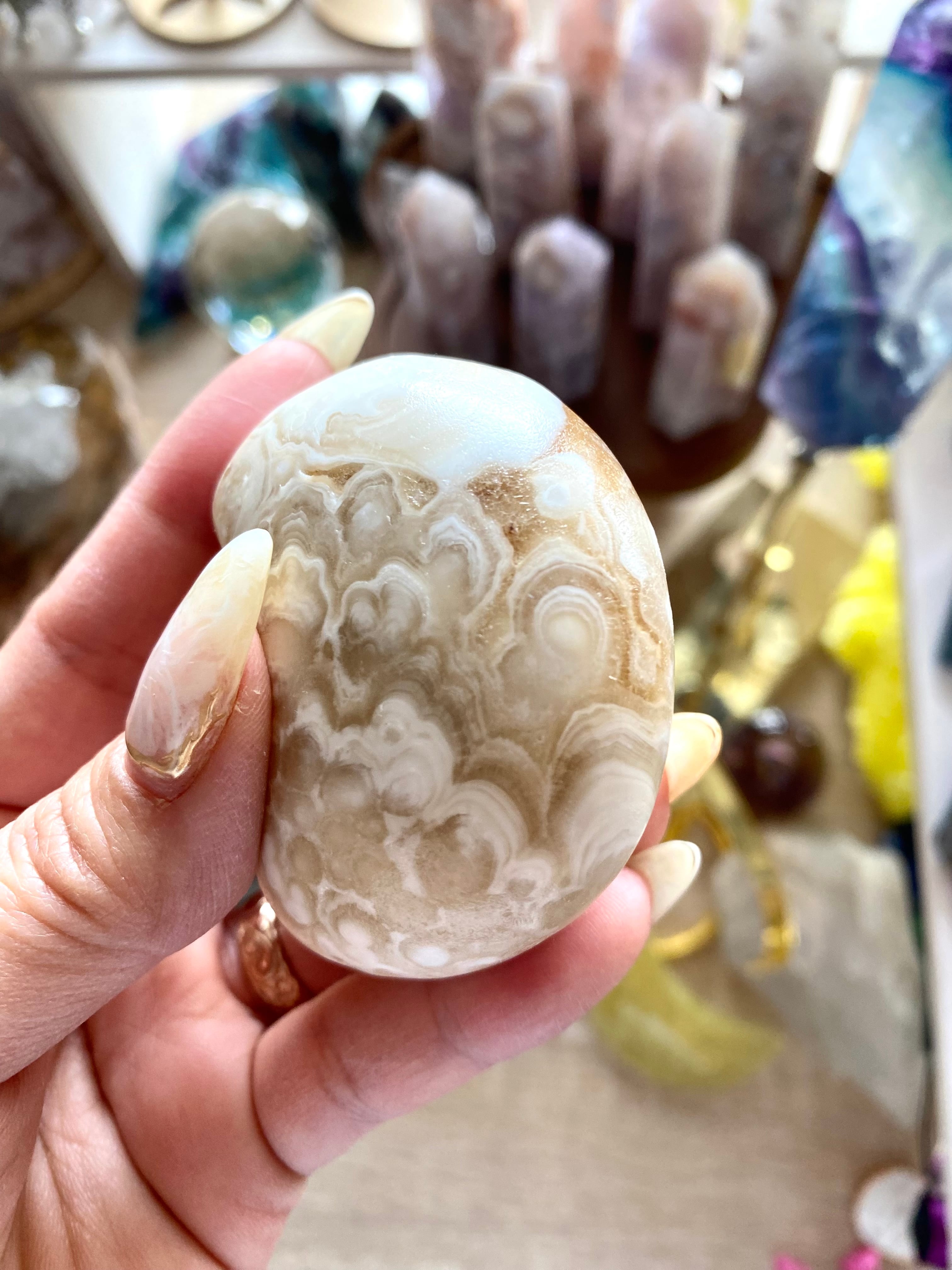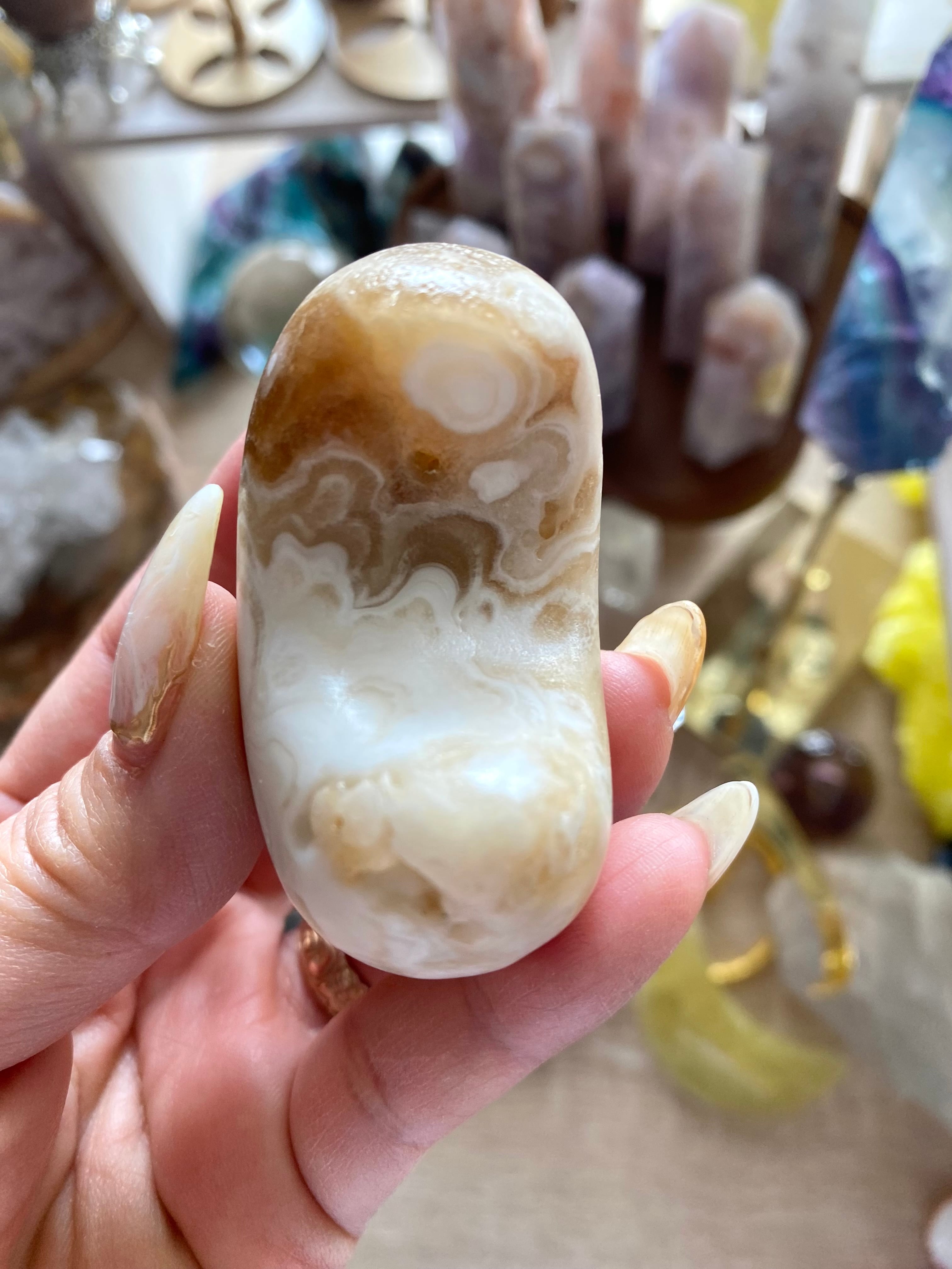 チョコレートカルサイトは、持つ人の小さな幸せをサポートします。 喜びのための石です。 チョコレートを楽しみに食べるような、目の前のコーヒーを楽しむような、至福の瞬間をもたらしてくれます。 繁栄と成長の石でもあり、自分の願いに気づき、人生のハッピーに気づく心を養わせてくれます。