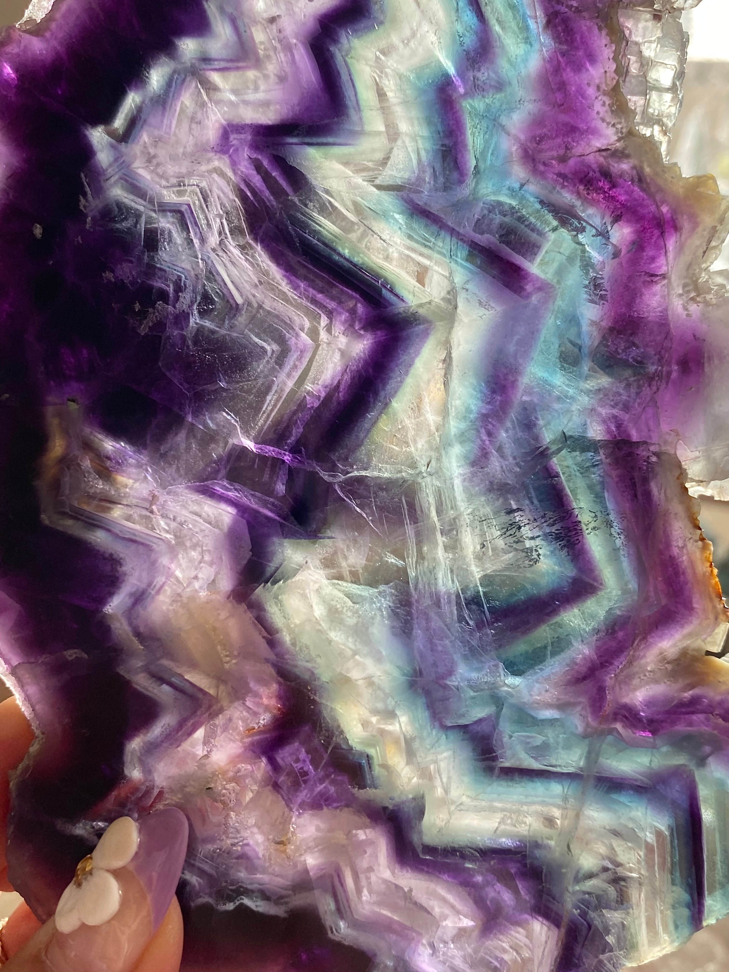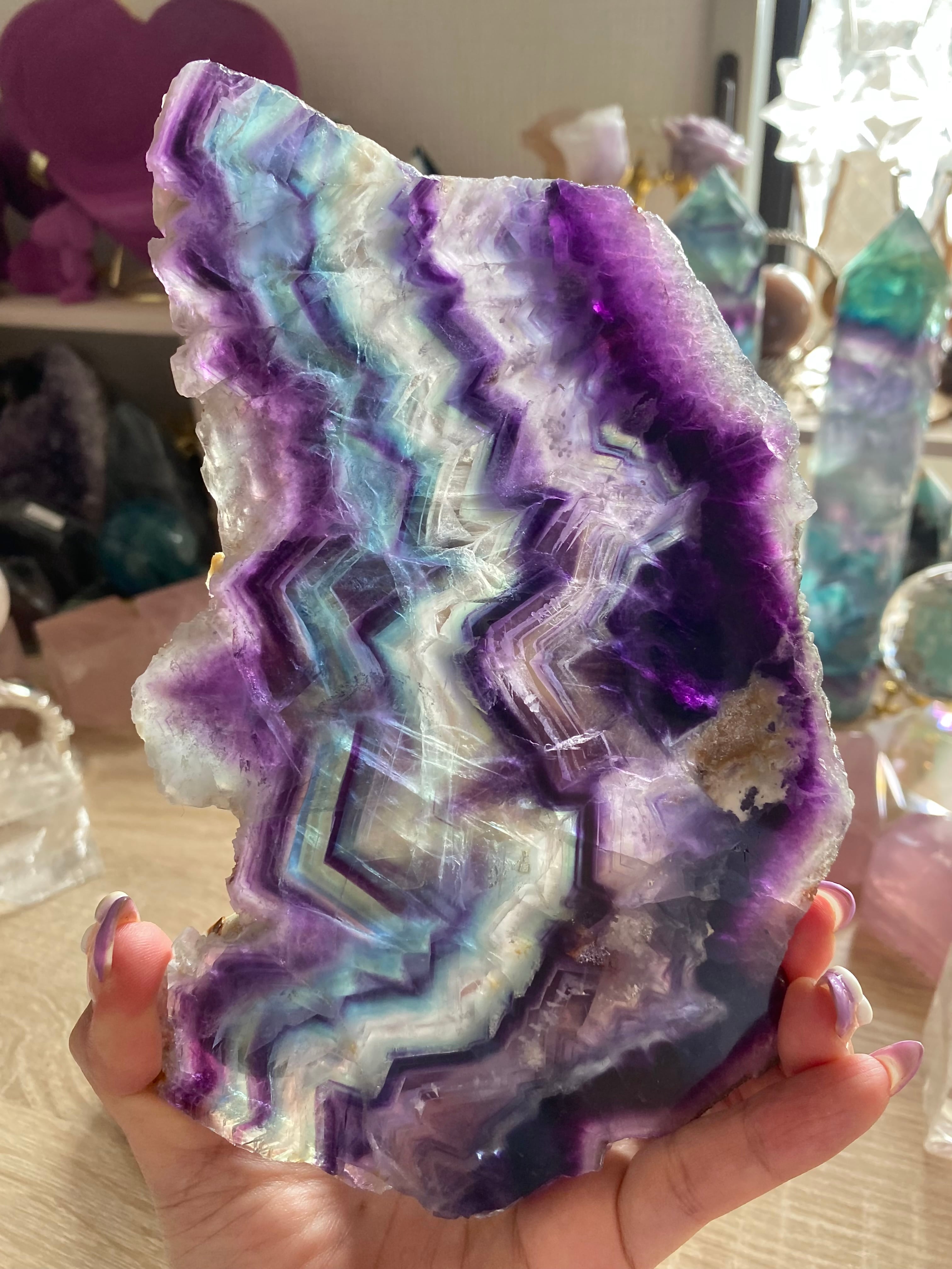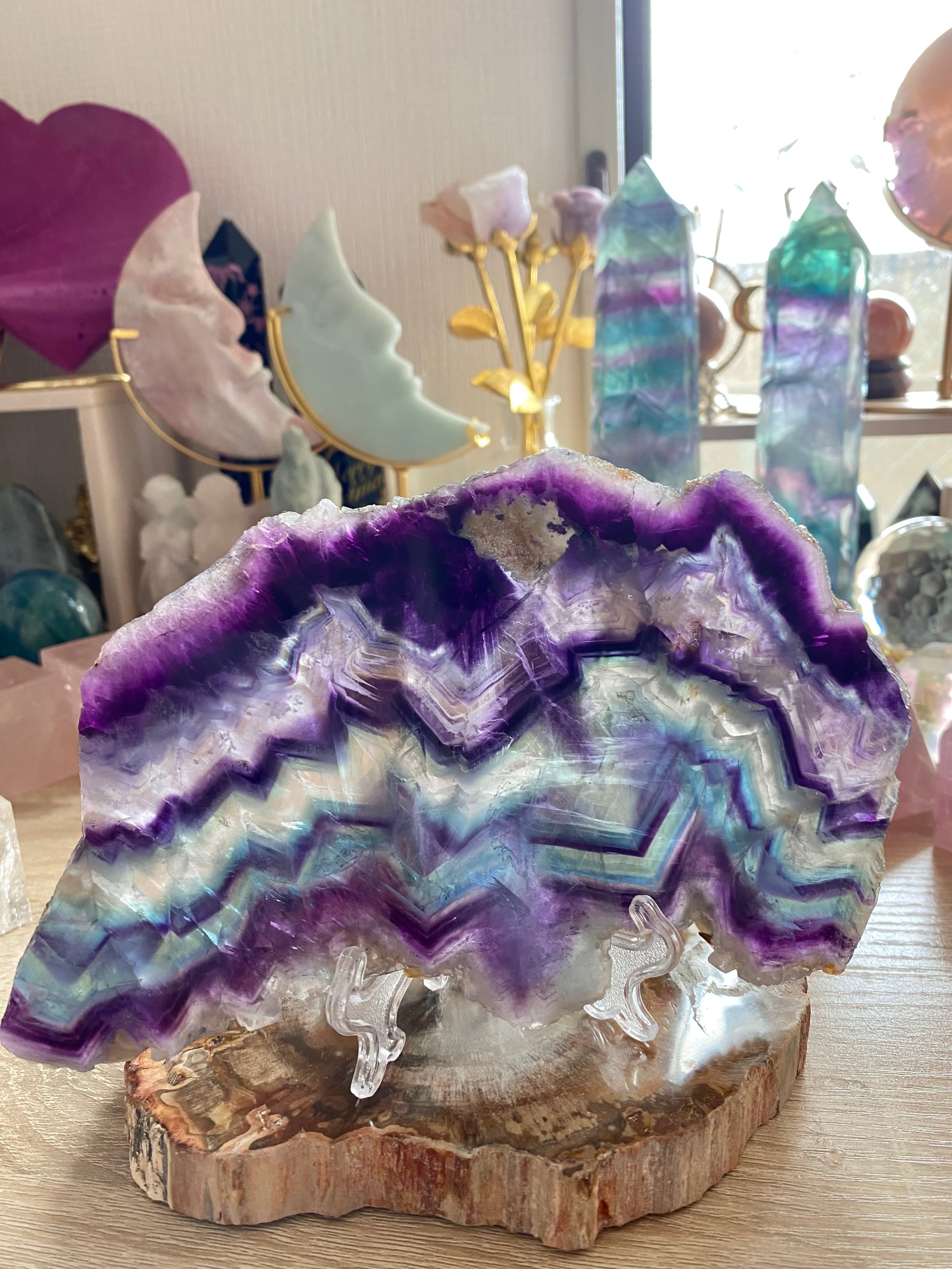 透明感抜群!品質最高のパープル、ブルーのコントラストが美しいギザギザしましま模様が美しいフローライトslabです!
