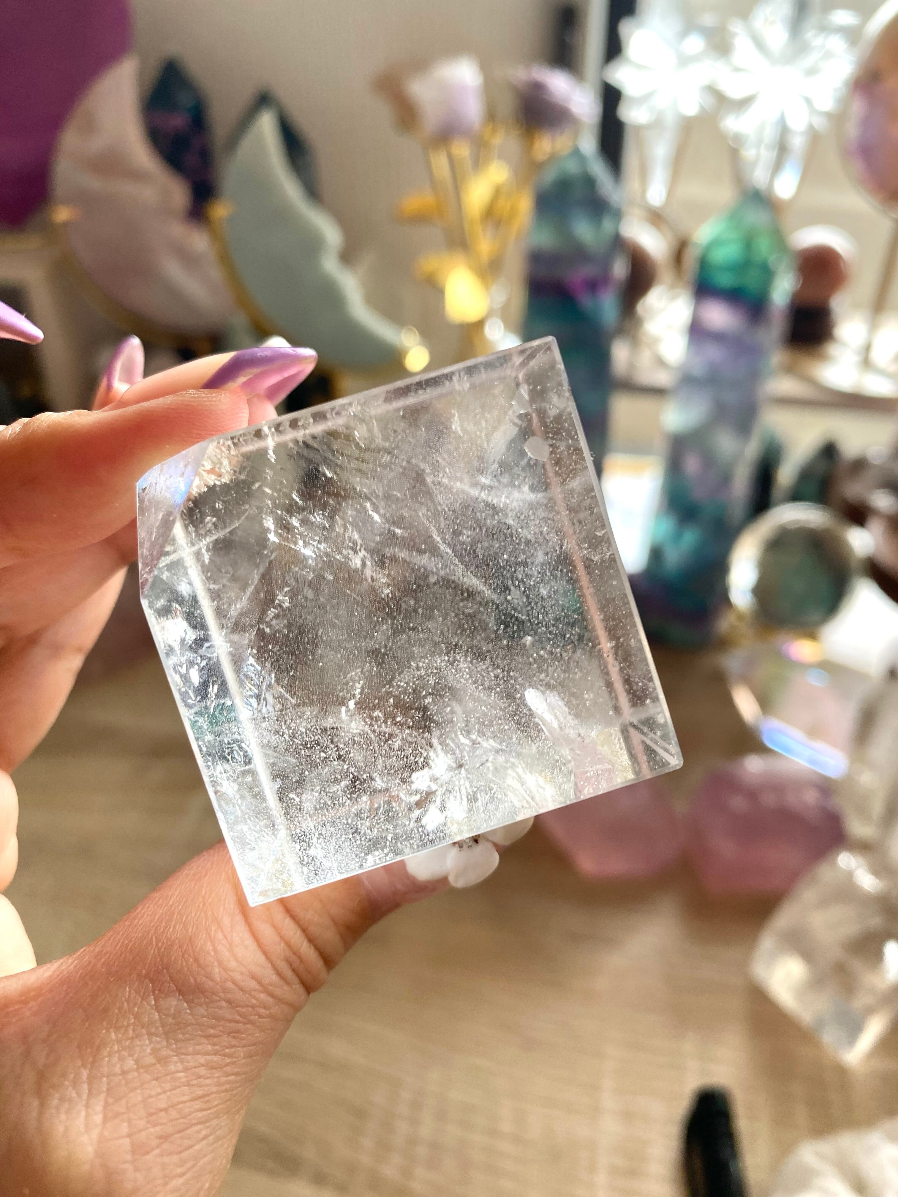 クリスタル キューブのご紹介です!美しいキューブカットが施されたこのクリスタルは、光を捉え、透き通った輝きを放ちます!