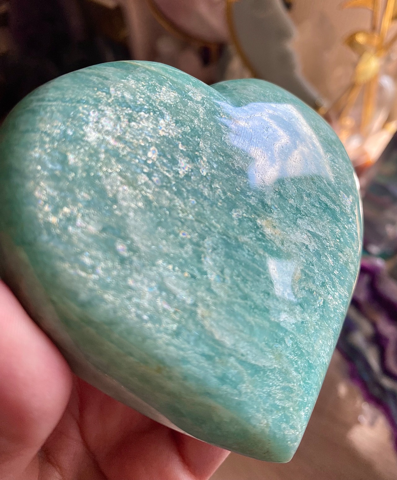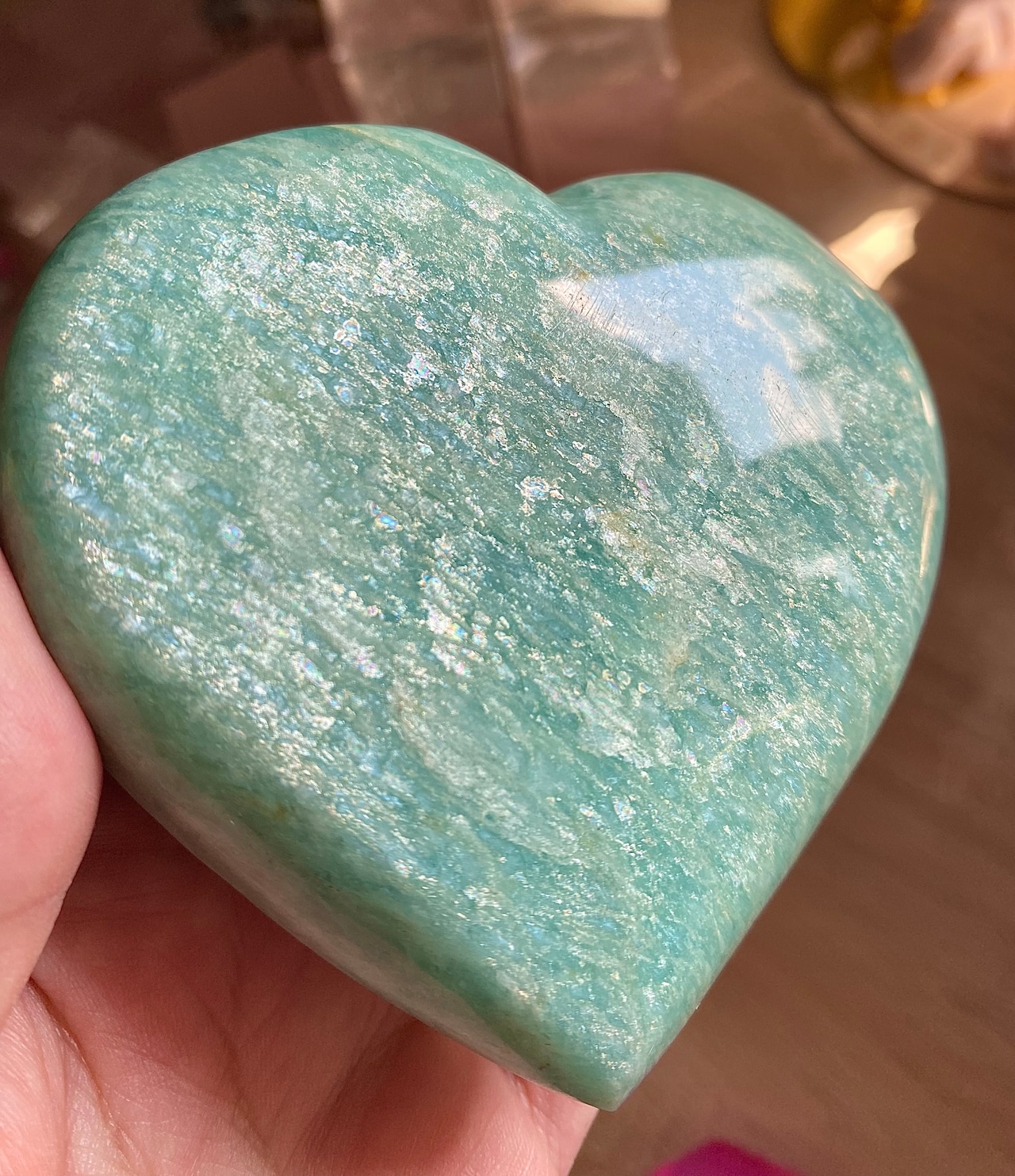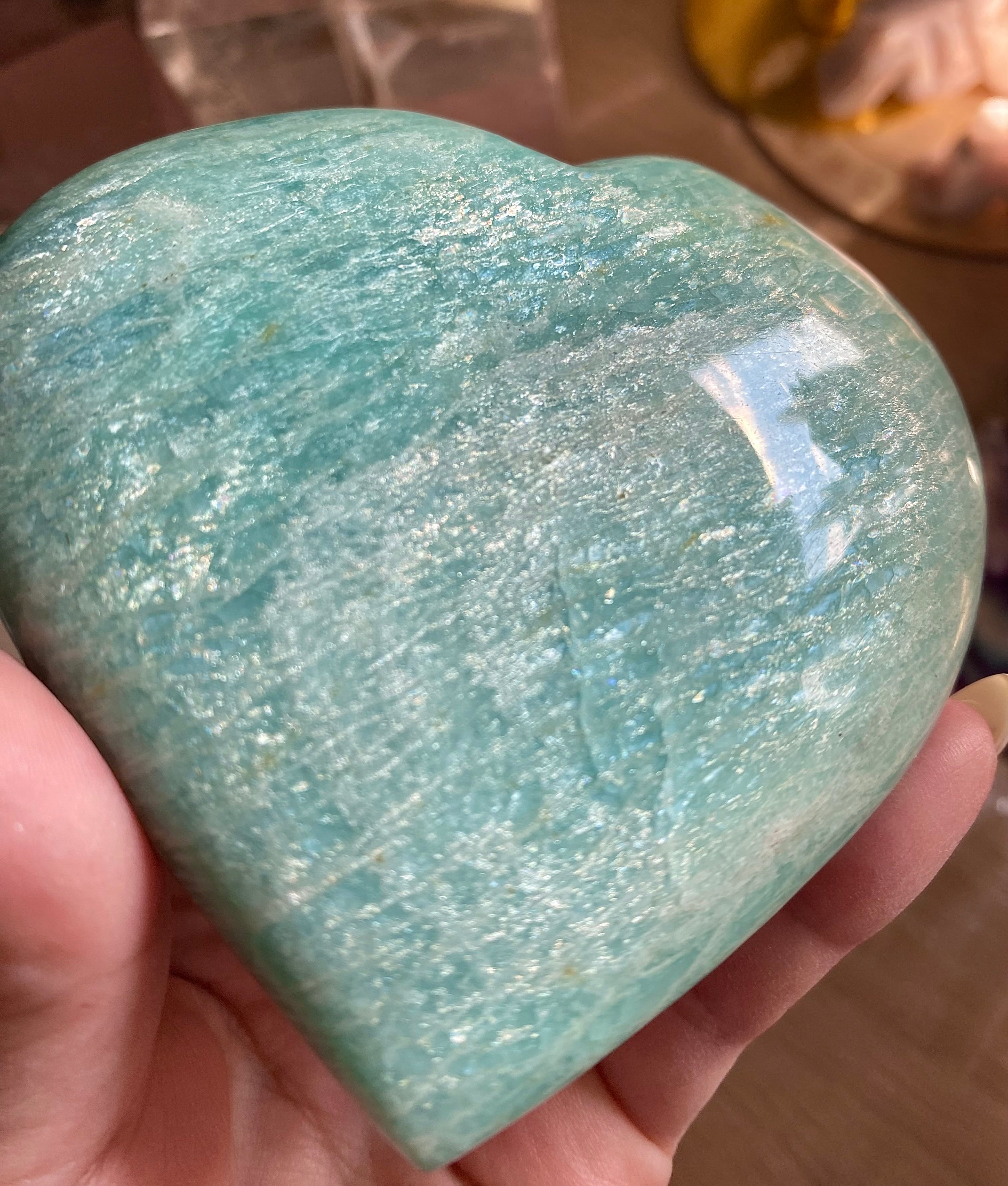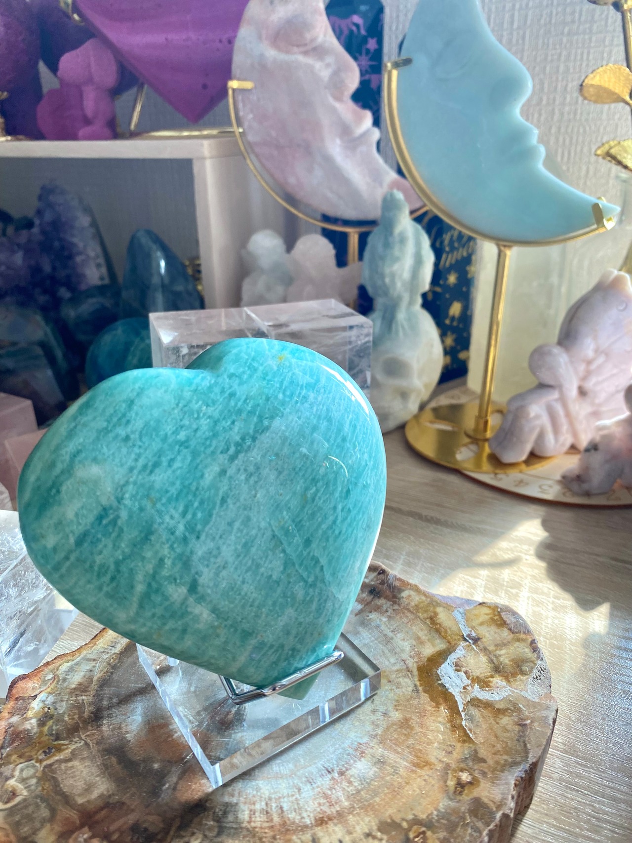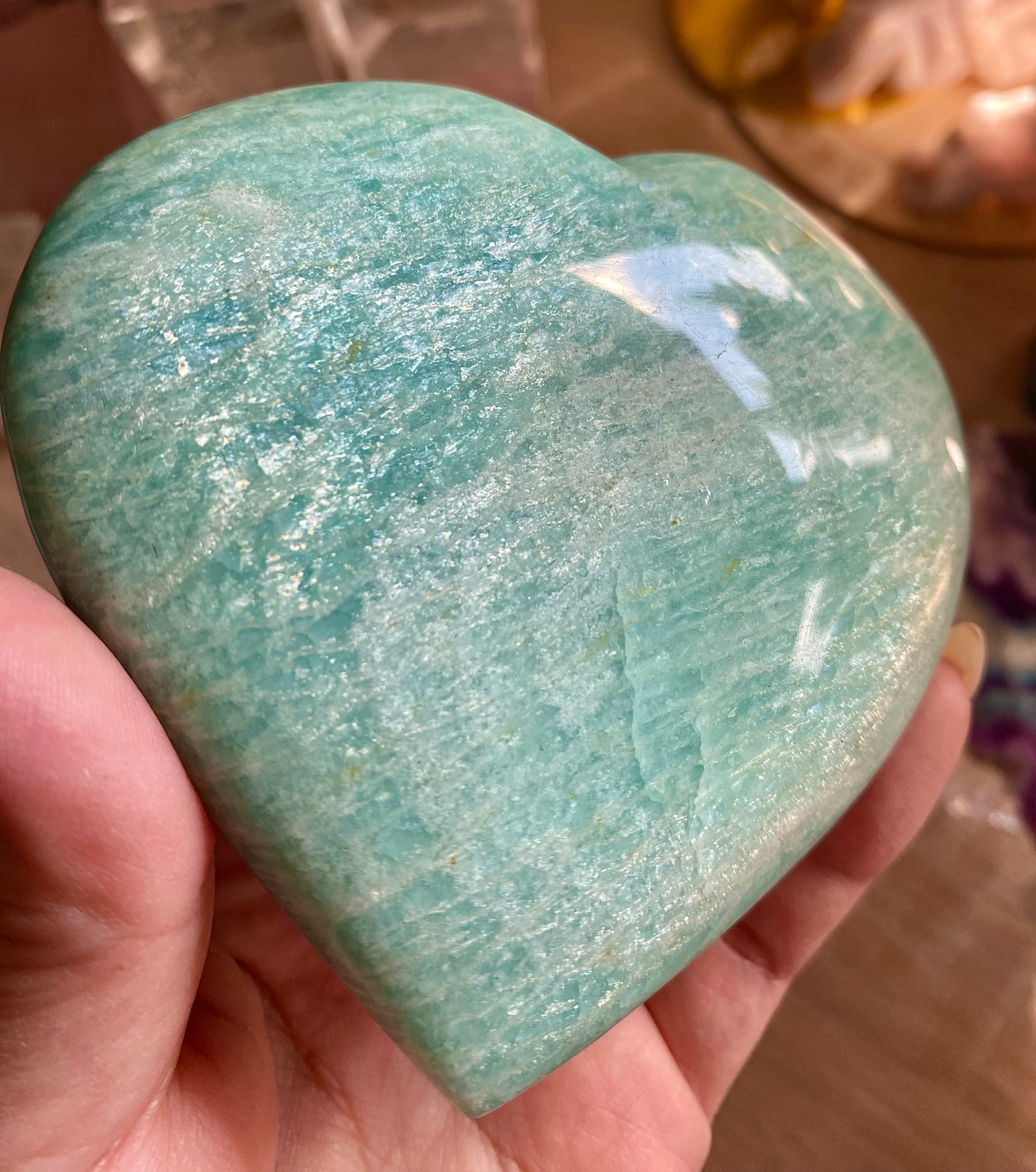 穏やかなブルーグリーンのアマゾナイトは、心の平穏をもたらす天然石として知られています。このハート型にカットされた一品は、インテリアの素敵なアクセントとしてだけでなく、心のこもったギフトとしても大変喜ばれることでしょう!その優雅なフォルムが、どの空間にも温かみを加えます♡