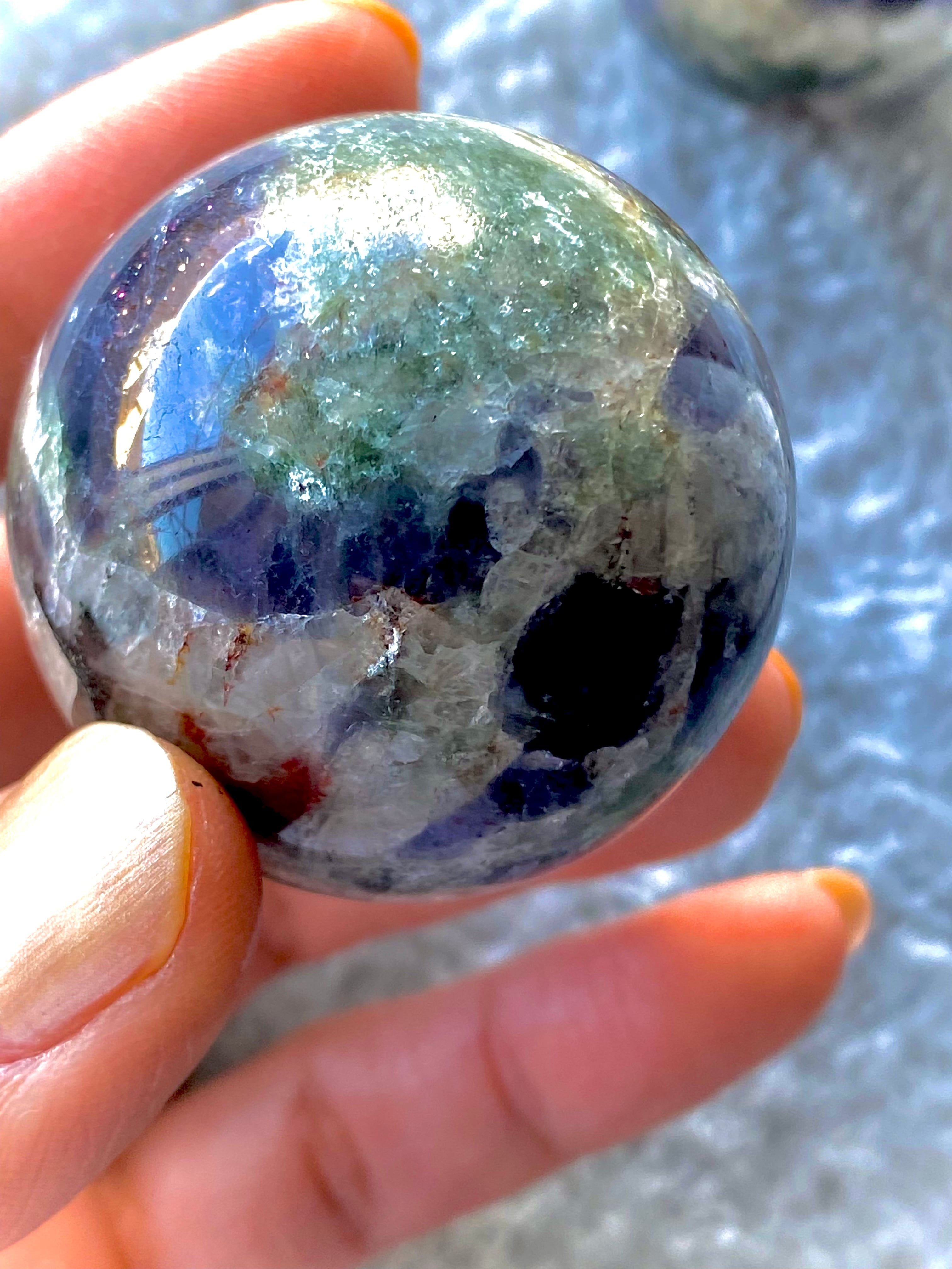アイオライトの中にサンストーンが完全にとけ込み、その中にキラキラしたアベンチュレッセンスが見られる『ブラッドショットアイオライト』です!