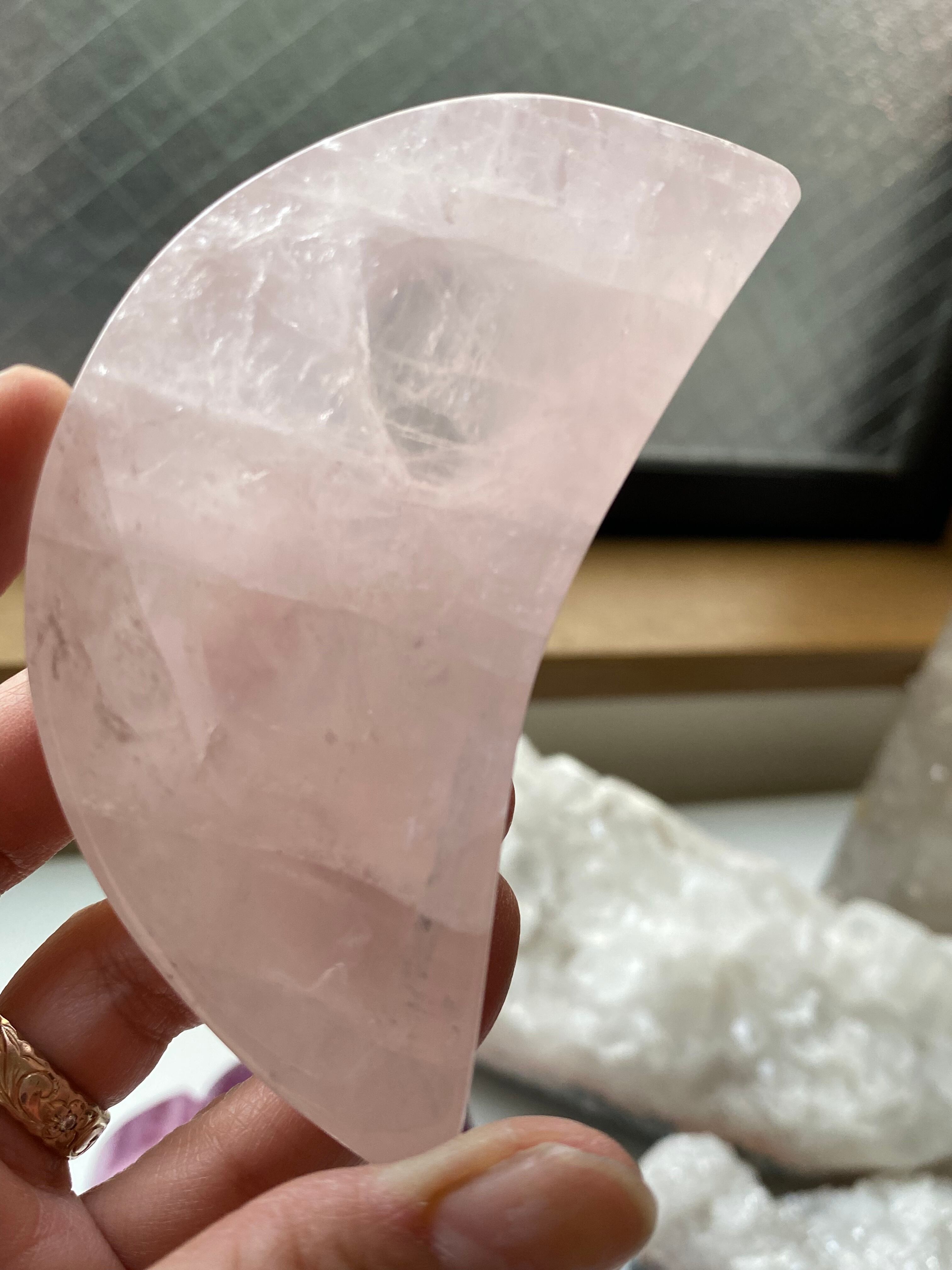 ローズクォーツの月の形のお皿とレピドライトのハート型タンブルです♡