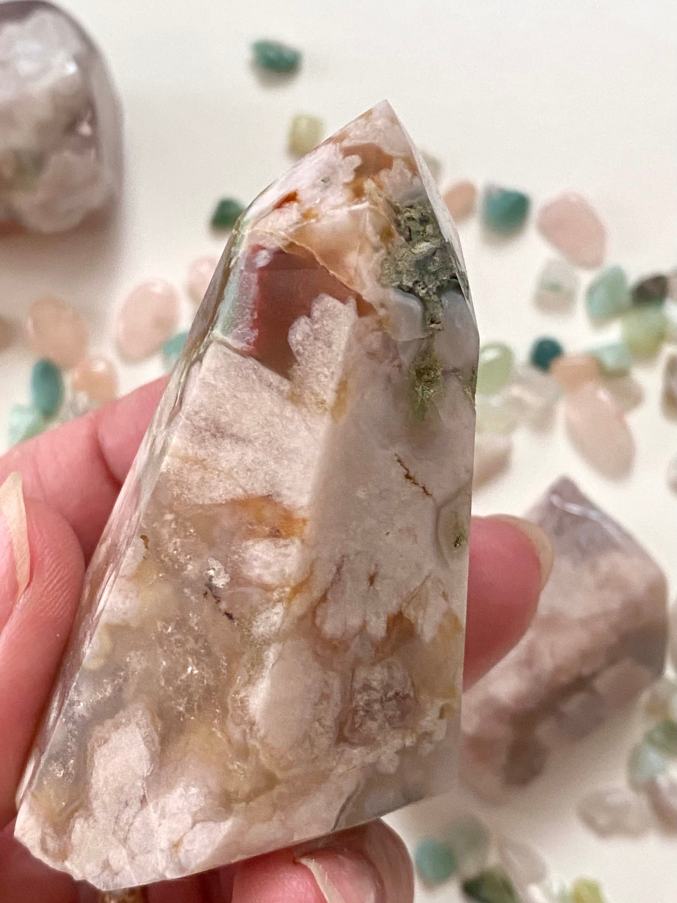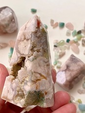 ジオードのピンクアメジストにフラワーアゲートが共生しているtowerになります。