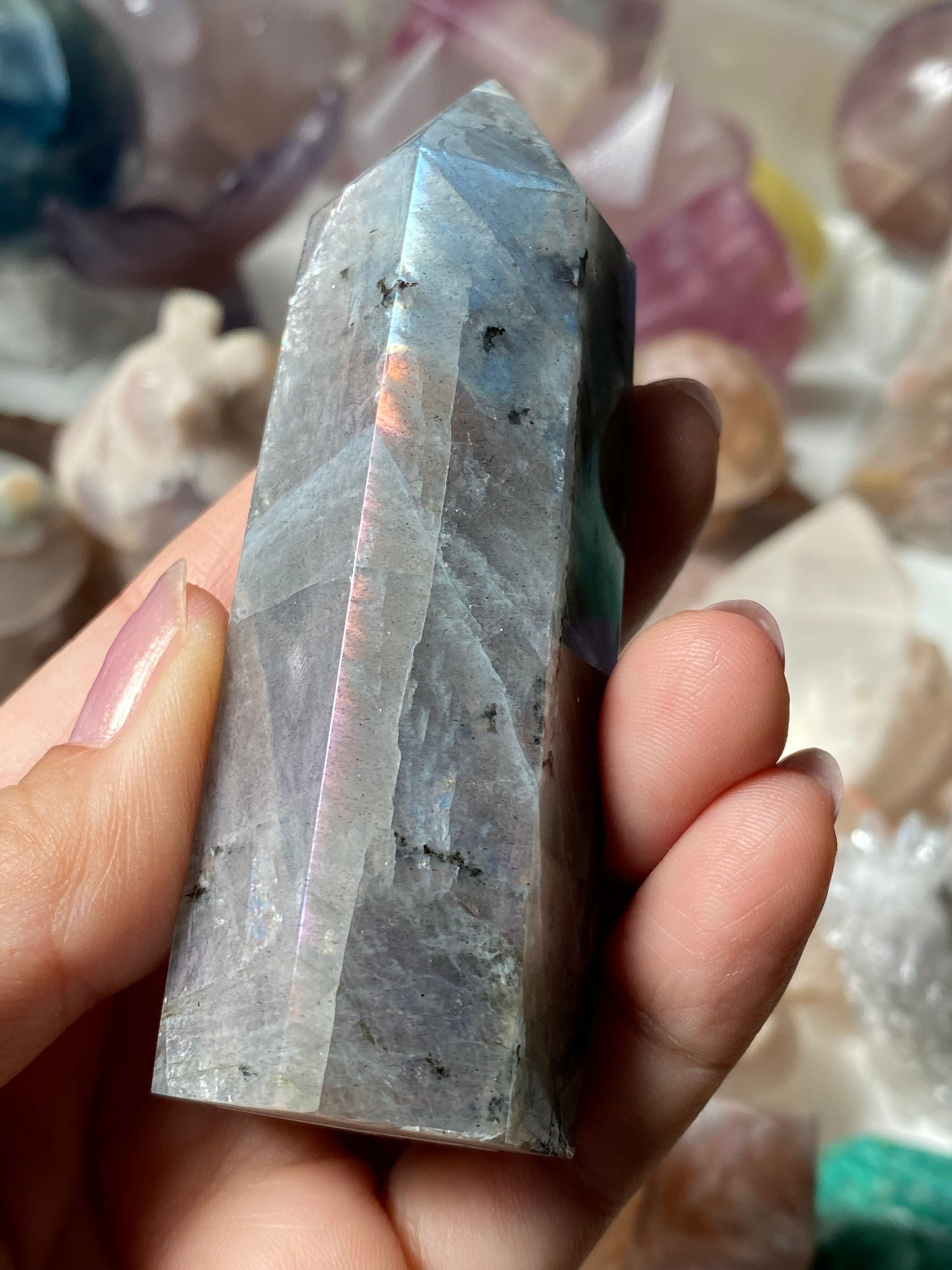 レインボーカラーのシラーが全面にはっきり見えて時間の許す限りくるくるくるくると回して見飽きることがないラブラドライトのtowerです♡