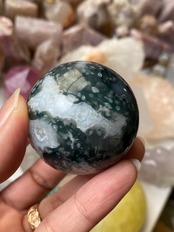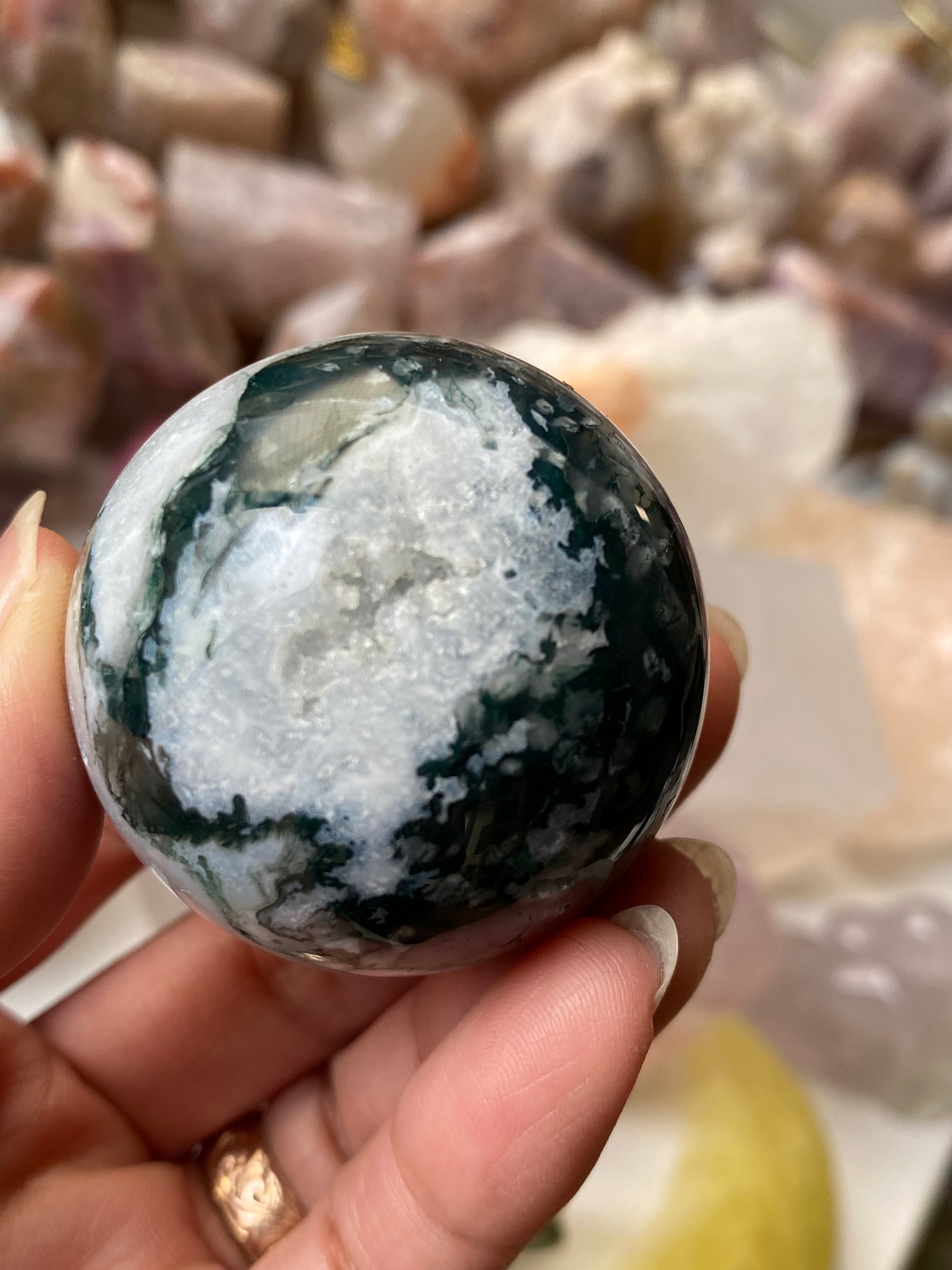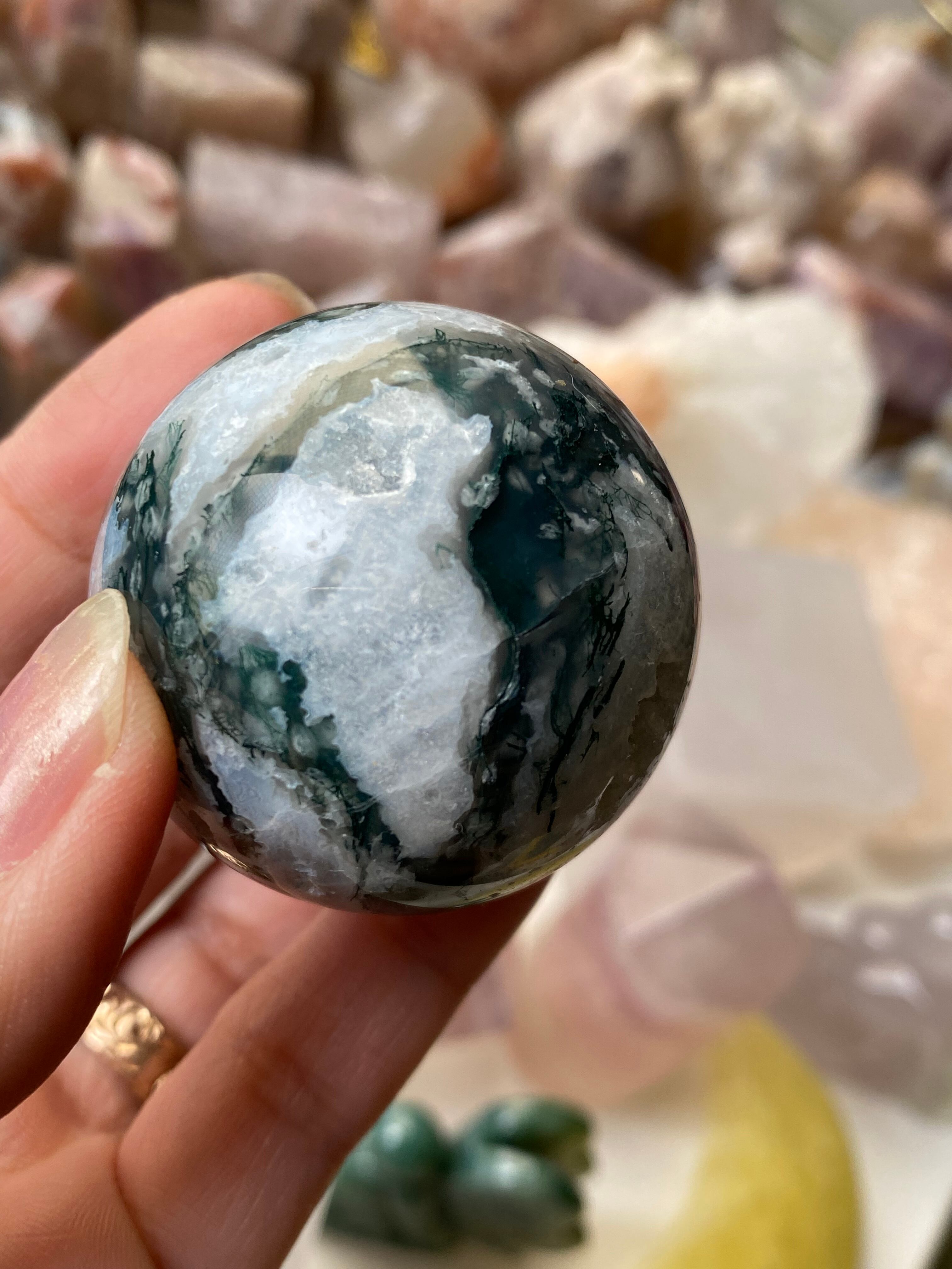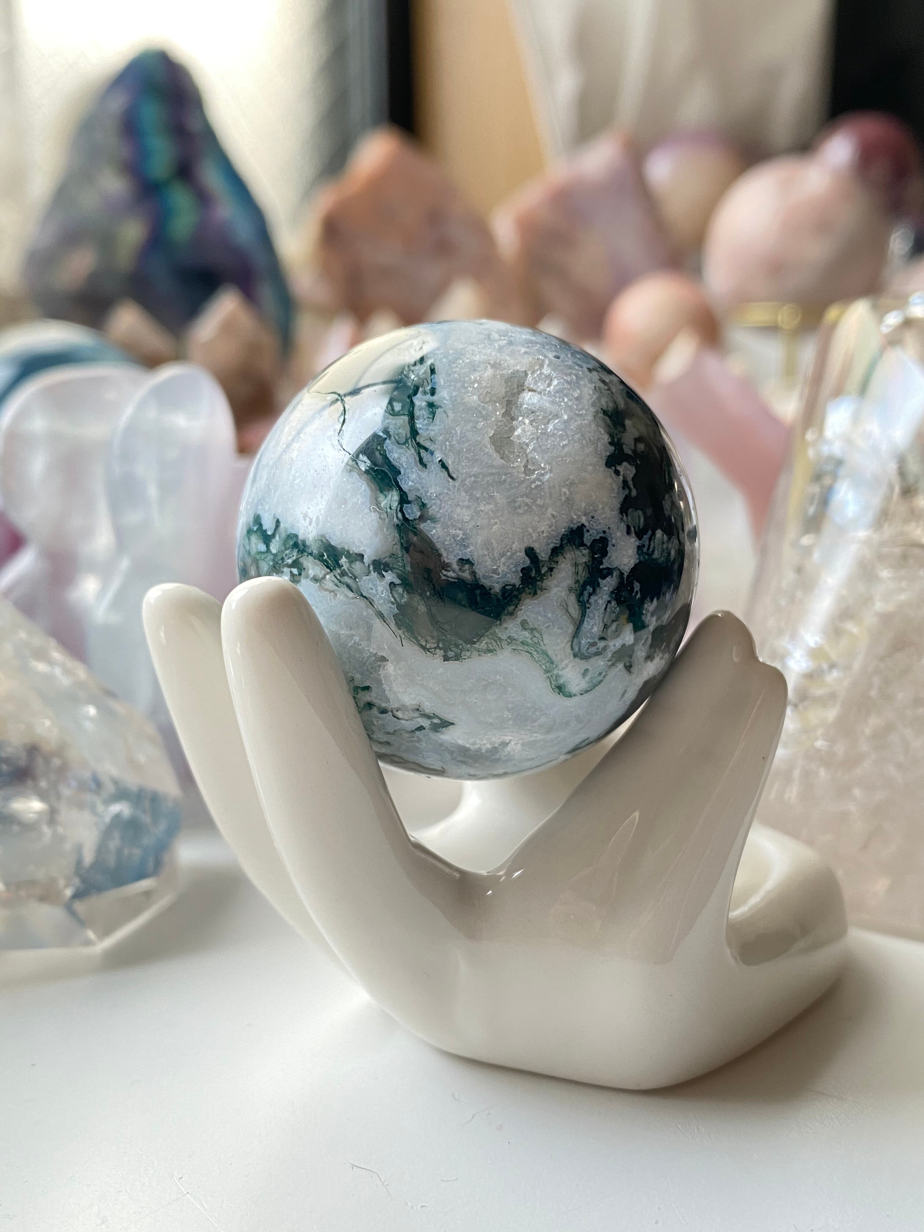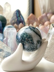 ジオード部分が笑い口になっていて、深い緑の部分は透明感もあり白いドット模様がこれまた可愛いモスアゲートのスフィア、おてての台座付きです⭐︎
