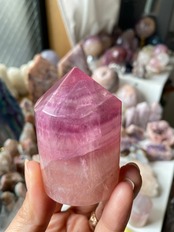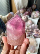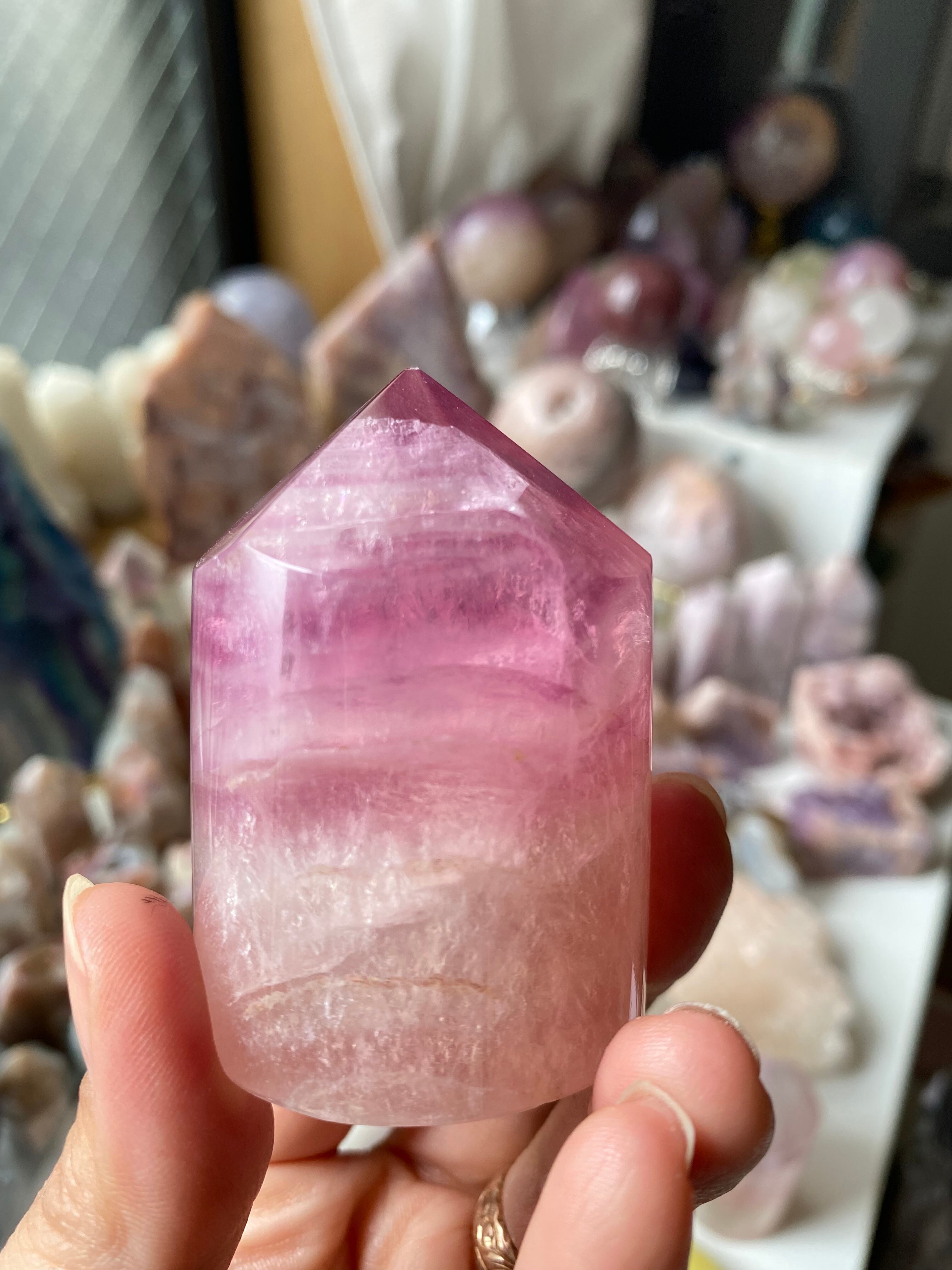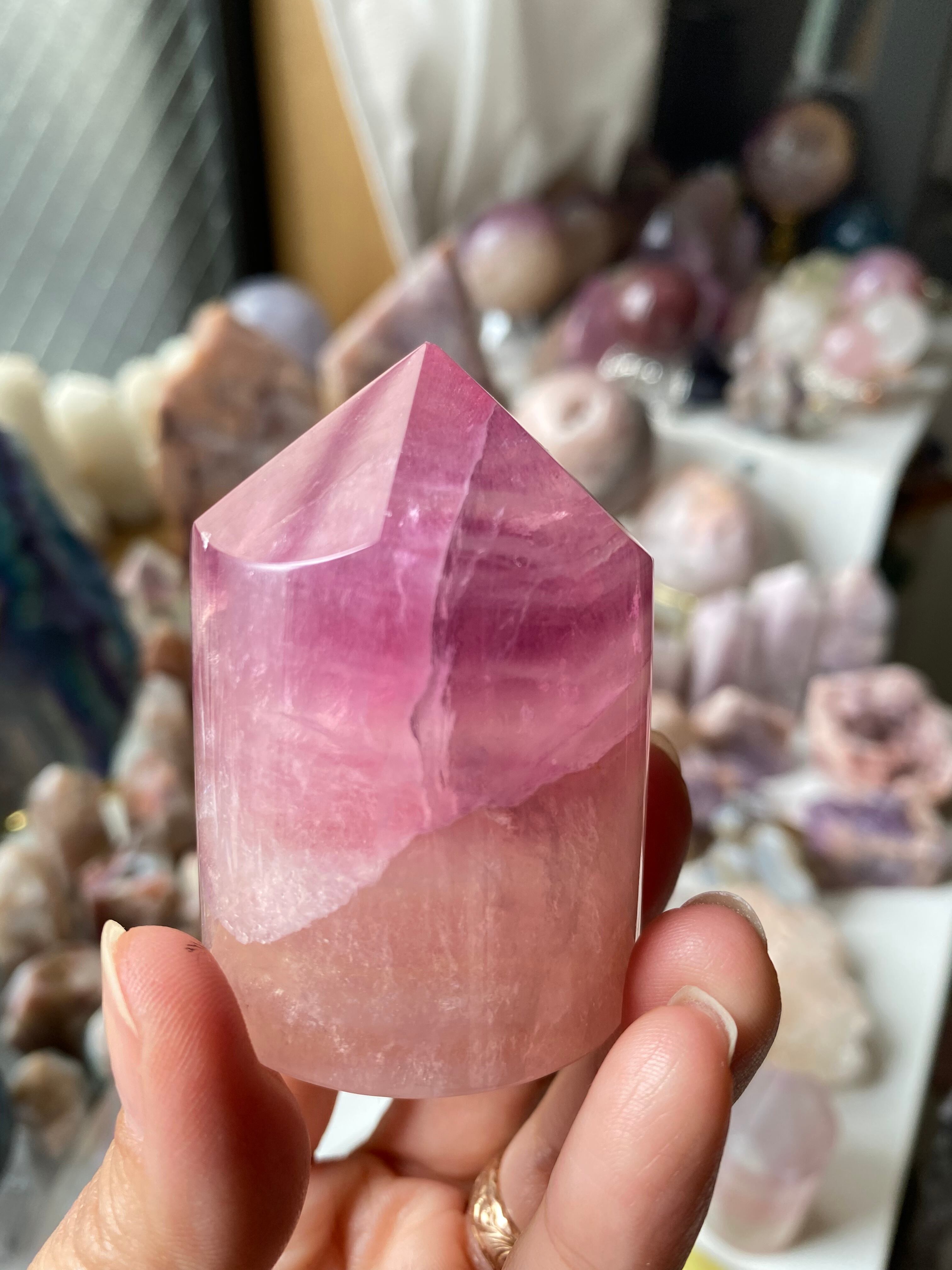 濃厚 pinkと淡い pinkの縦縞模様とが混ざり合ったグラデーションの部分と楽しませてくれるフローライトtowerです。