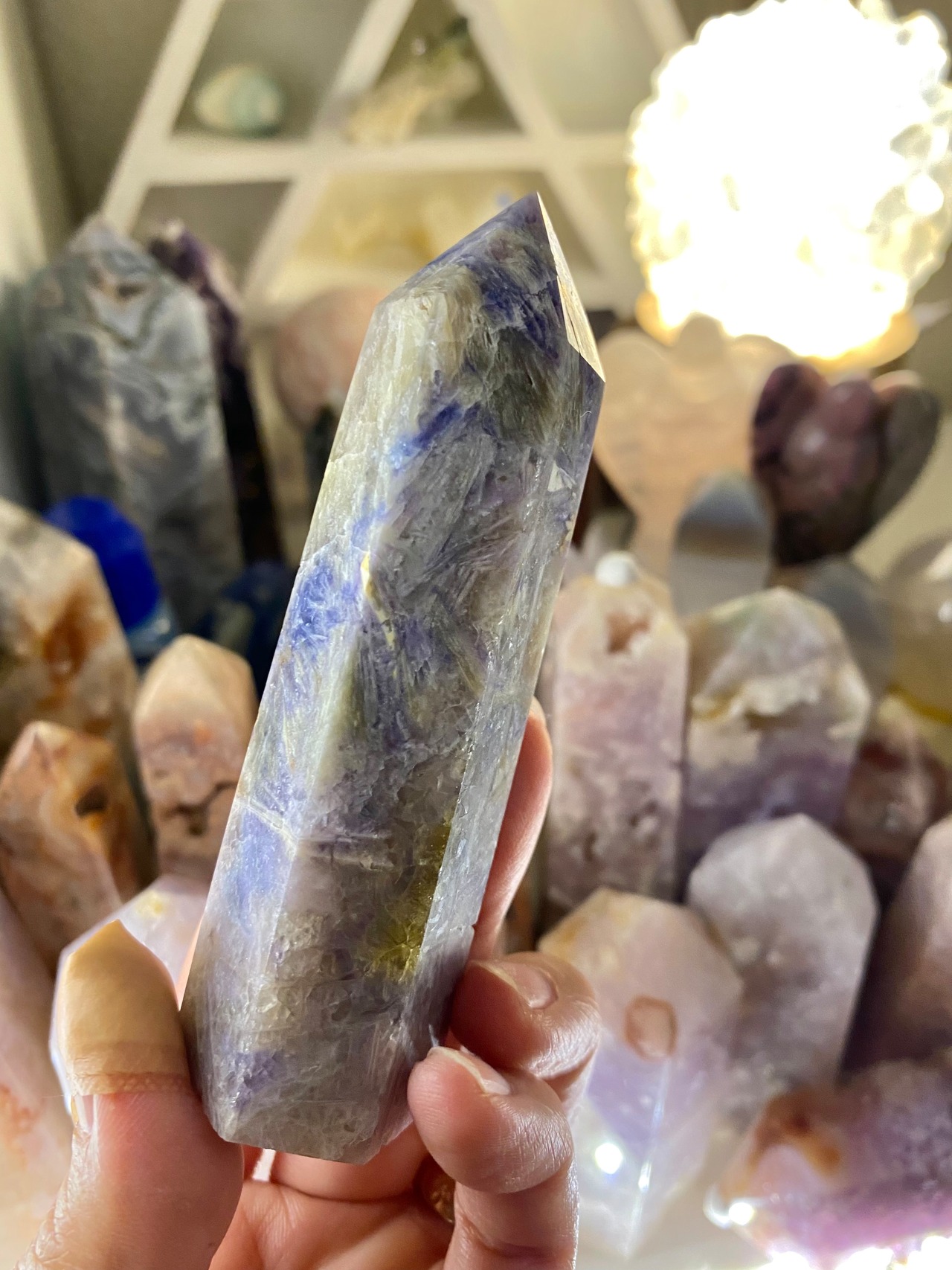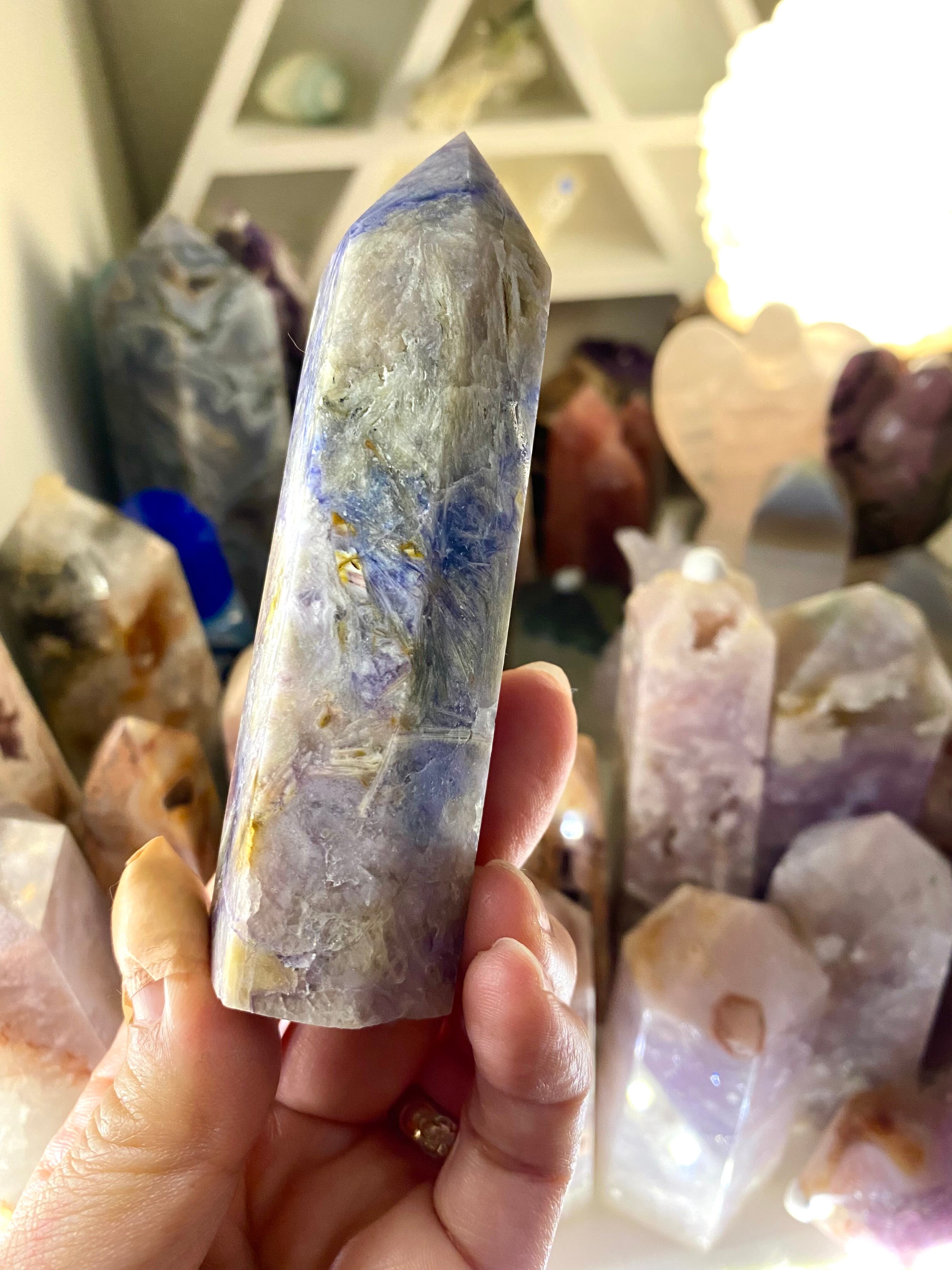 素敵な色合いマーブルの珍しいカイヤナイトのtowerです⭐︎白い結晶部分と藍色とラベンダーカラーのグラデーションがとても素敵です⭐︎