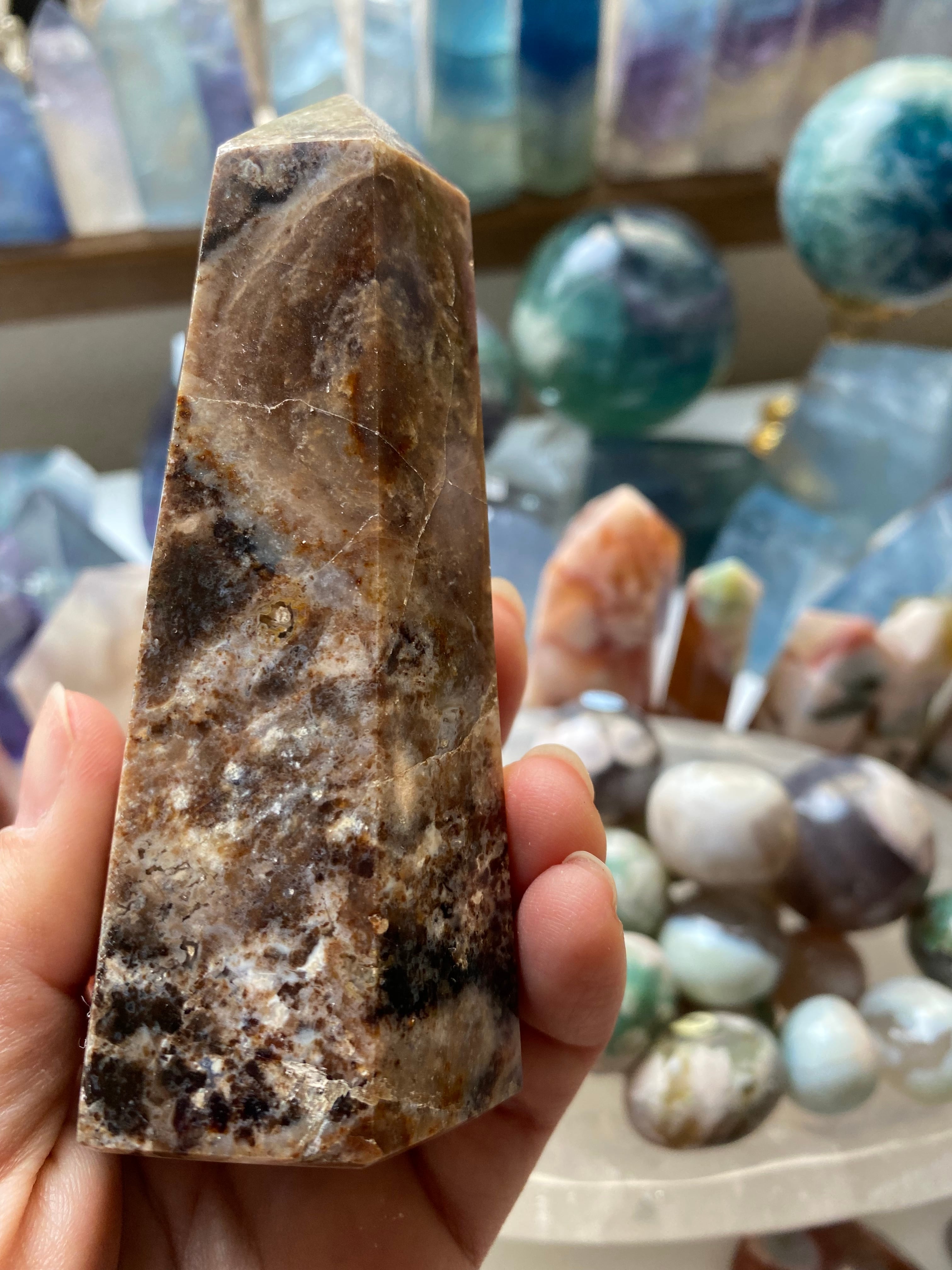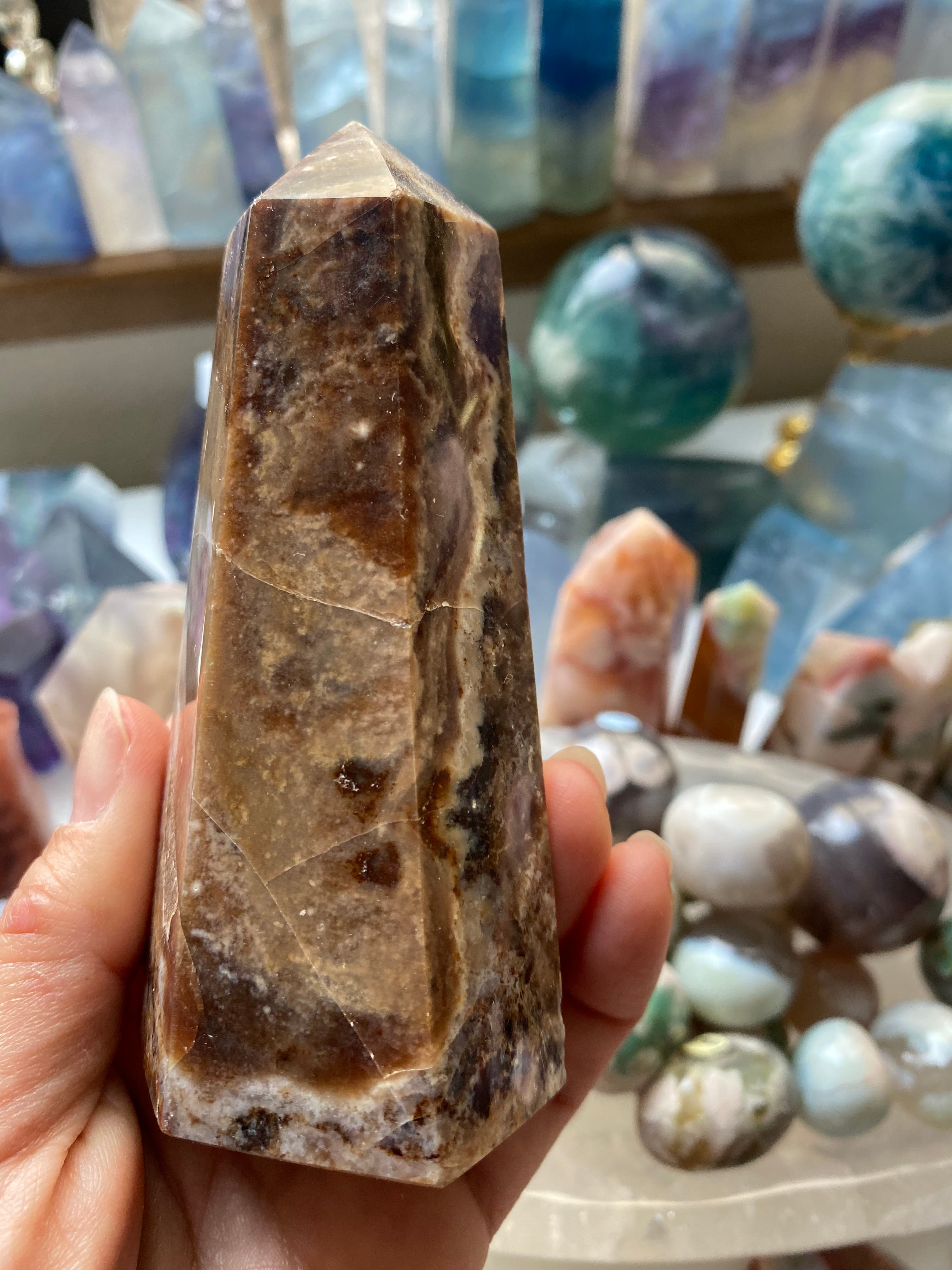 チョコレートカルサイトは、持つ人の小さな幸せをサポートします。 喜びのための石です。 チョコレートを楽しみに食べるような、目の前のコーヒーを楽しむような、至福の瞬間をもたらしてくれます。 繁栄と成長の石でもあり、自分の願いに気づき、人生のハッピーに気づく心を養わせてくれます。