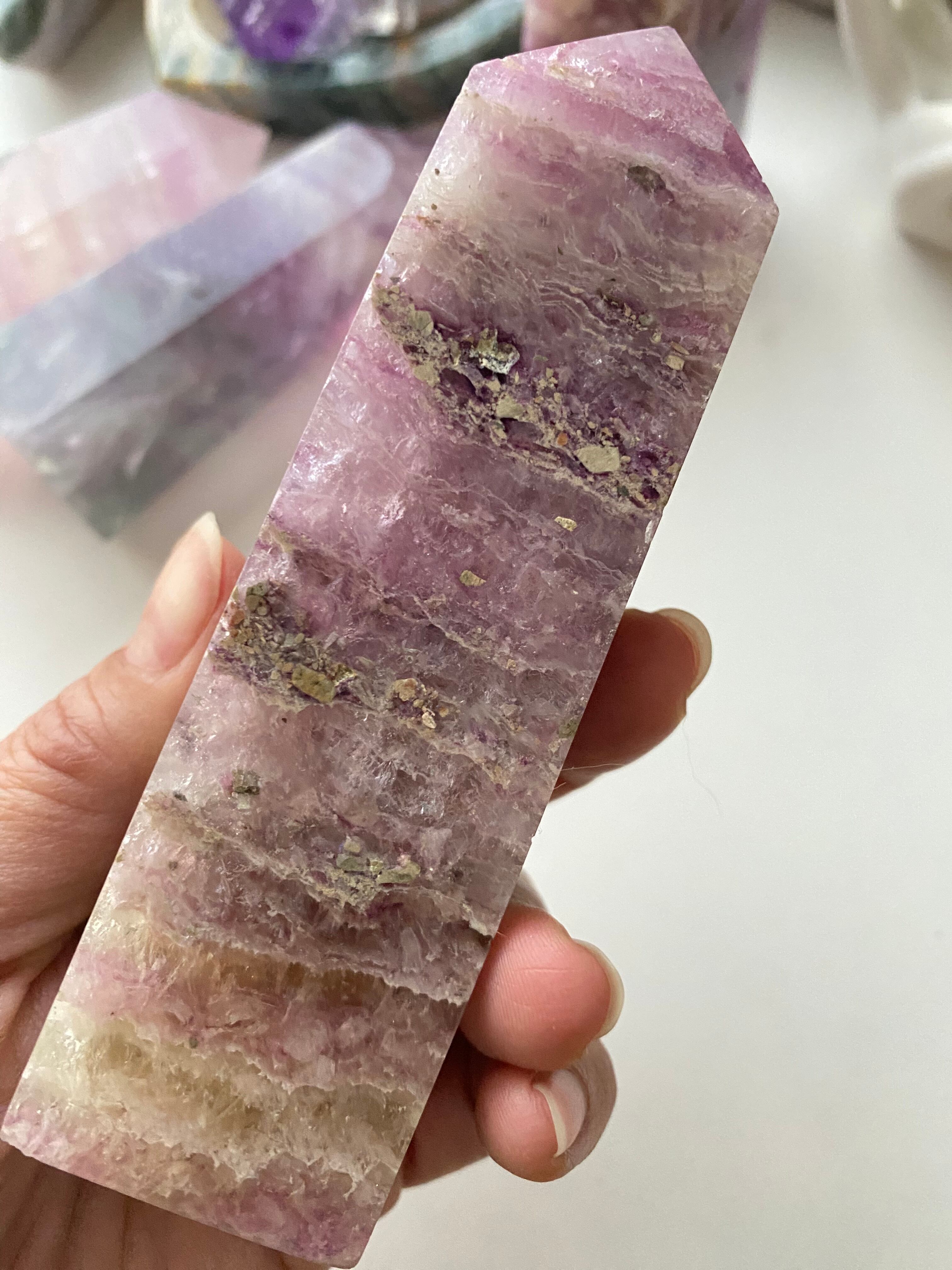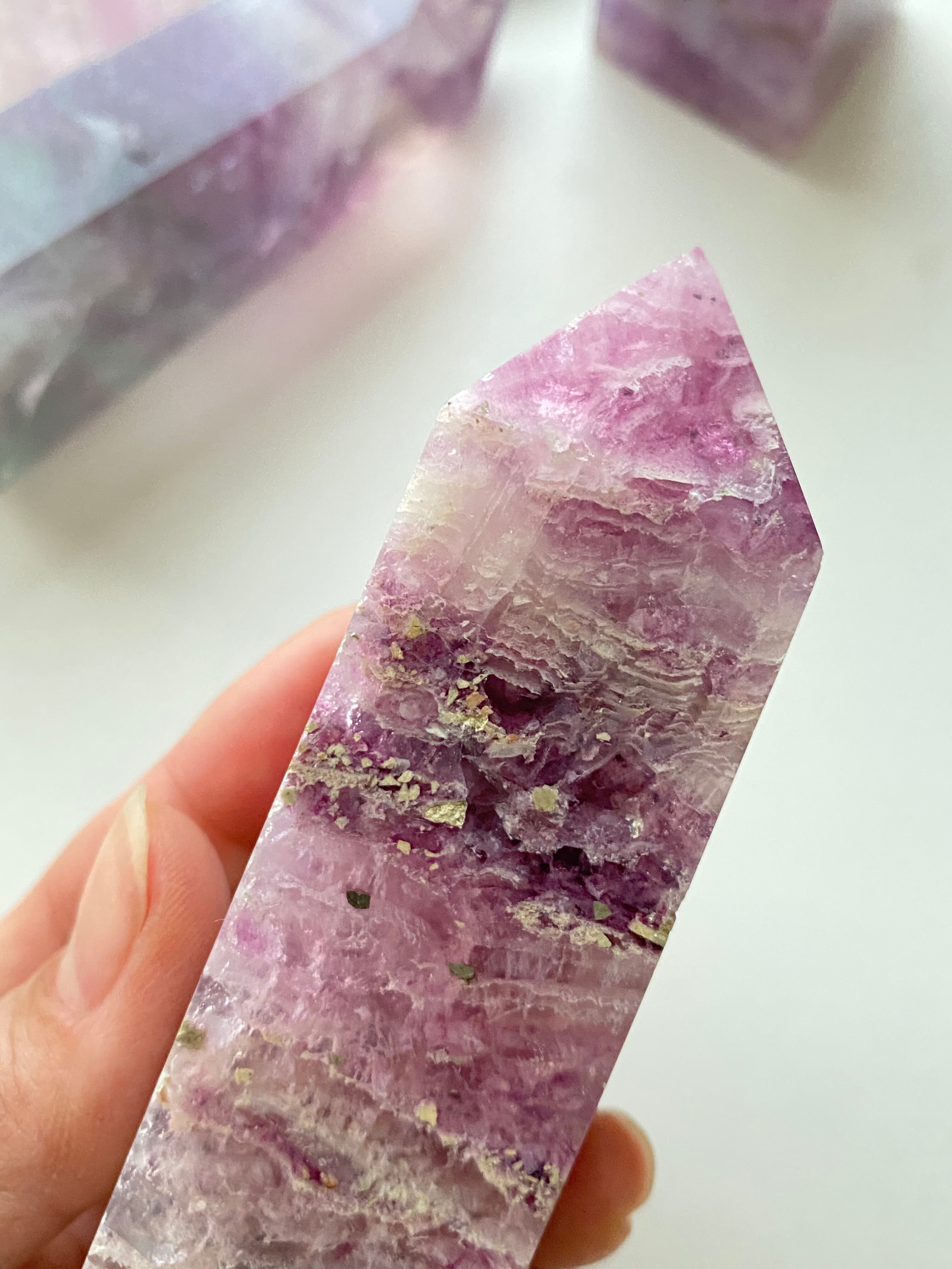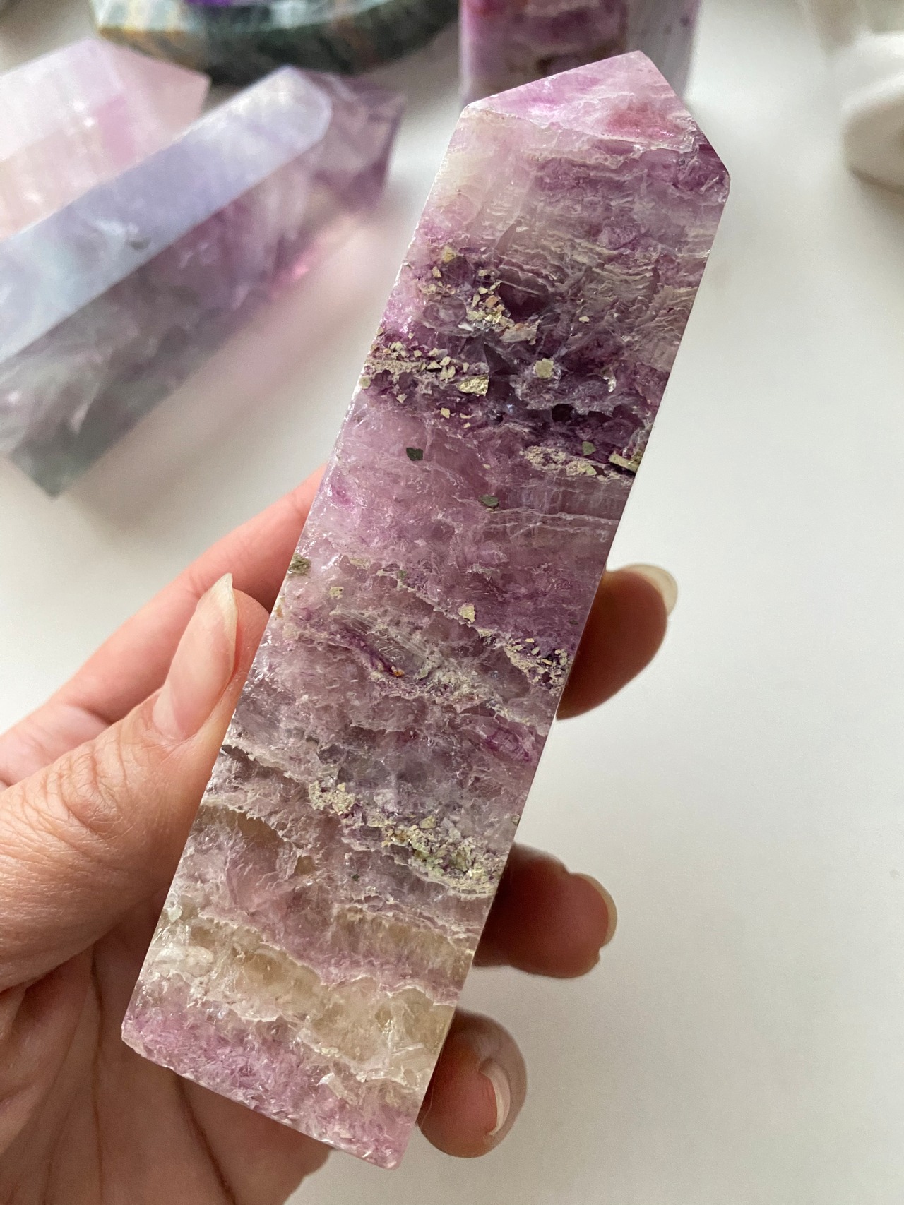 シルキーパープルフローライトにパイライトが共生しているtowerになります。