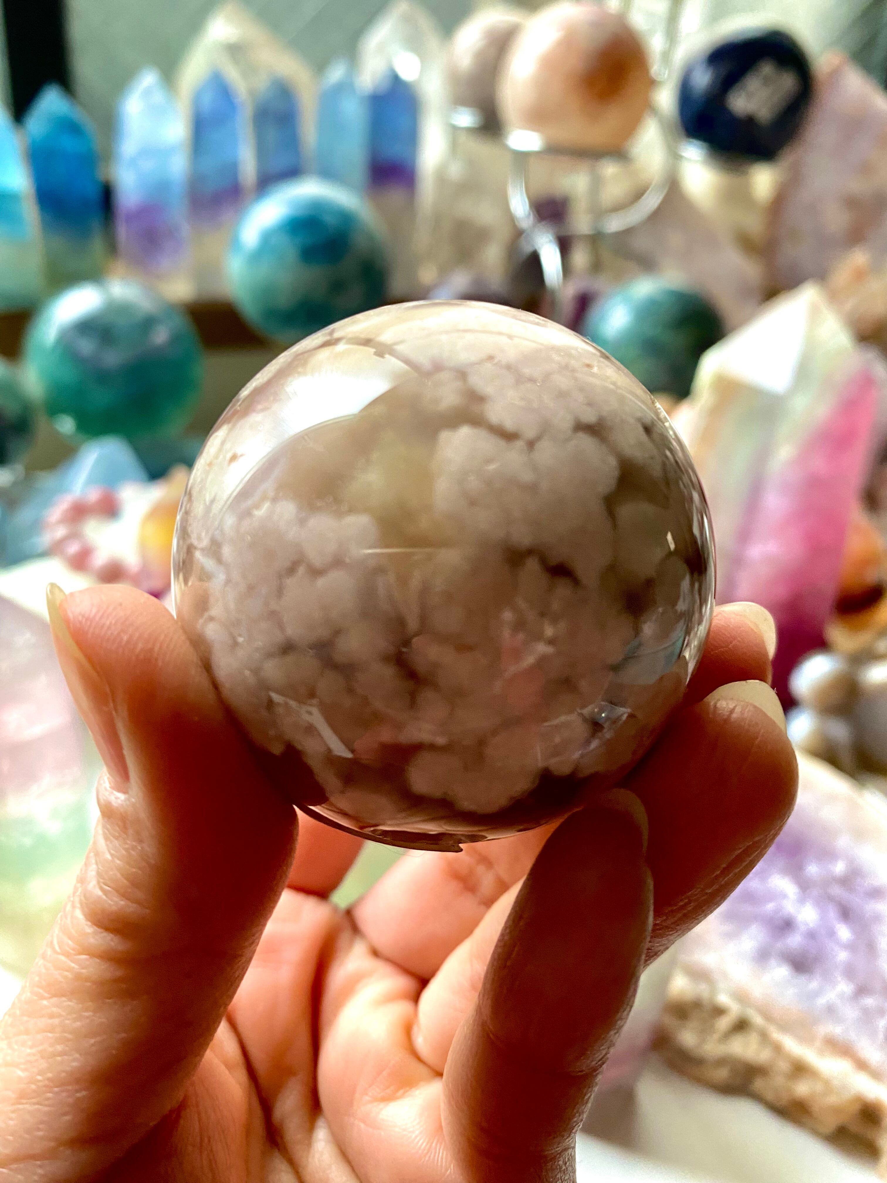 濃いピンク、淡いピンクの花が咲き乱れているブラック(ブラウンよりかな)ブラックフラワーアゲートのスフィアです♡