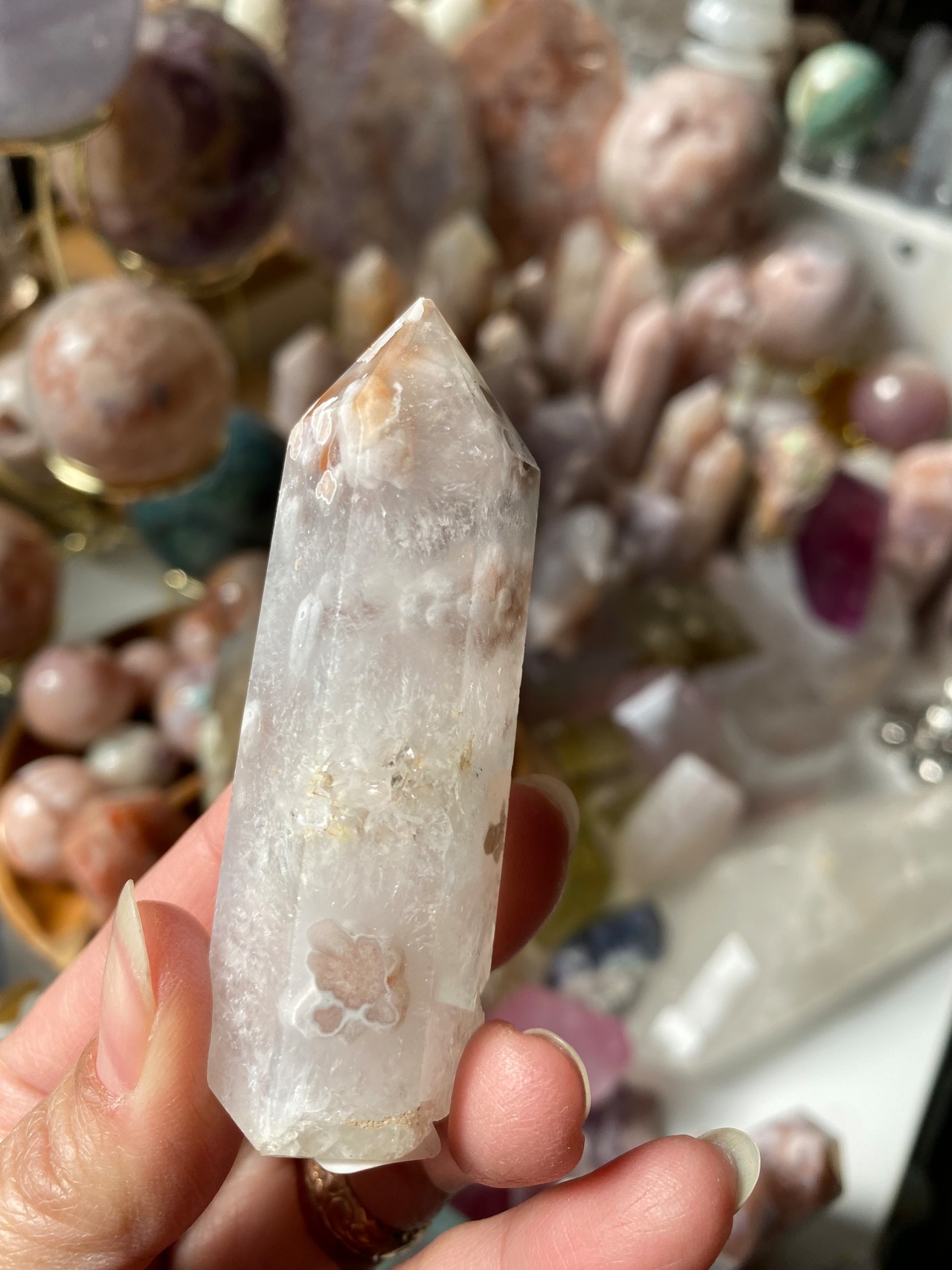 ザクキラクリスタルと可愛い桜の花びらがたくさんの桜瑪瑙ミニタワーです♡