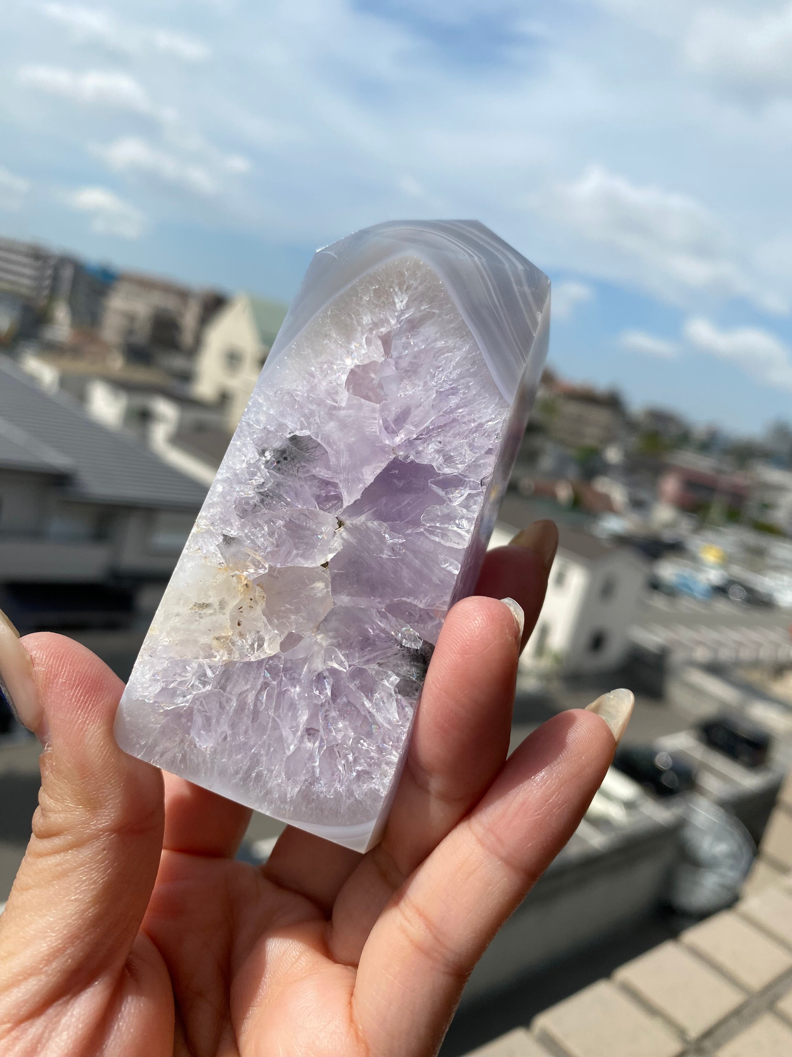 天使が喜ぶ優しいラベンダーカラーと、可愛らしいカルサイトがおまけでついている瑪瑙と共生しているタワーです♡